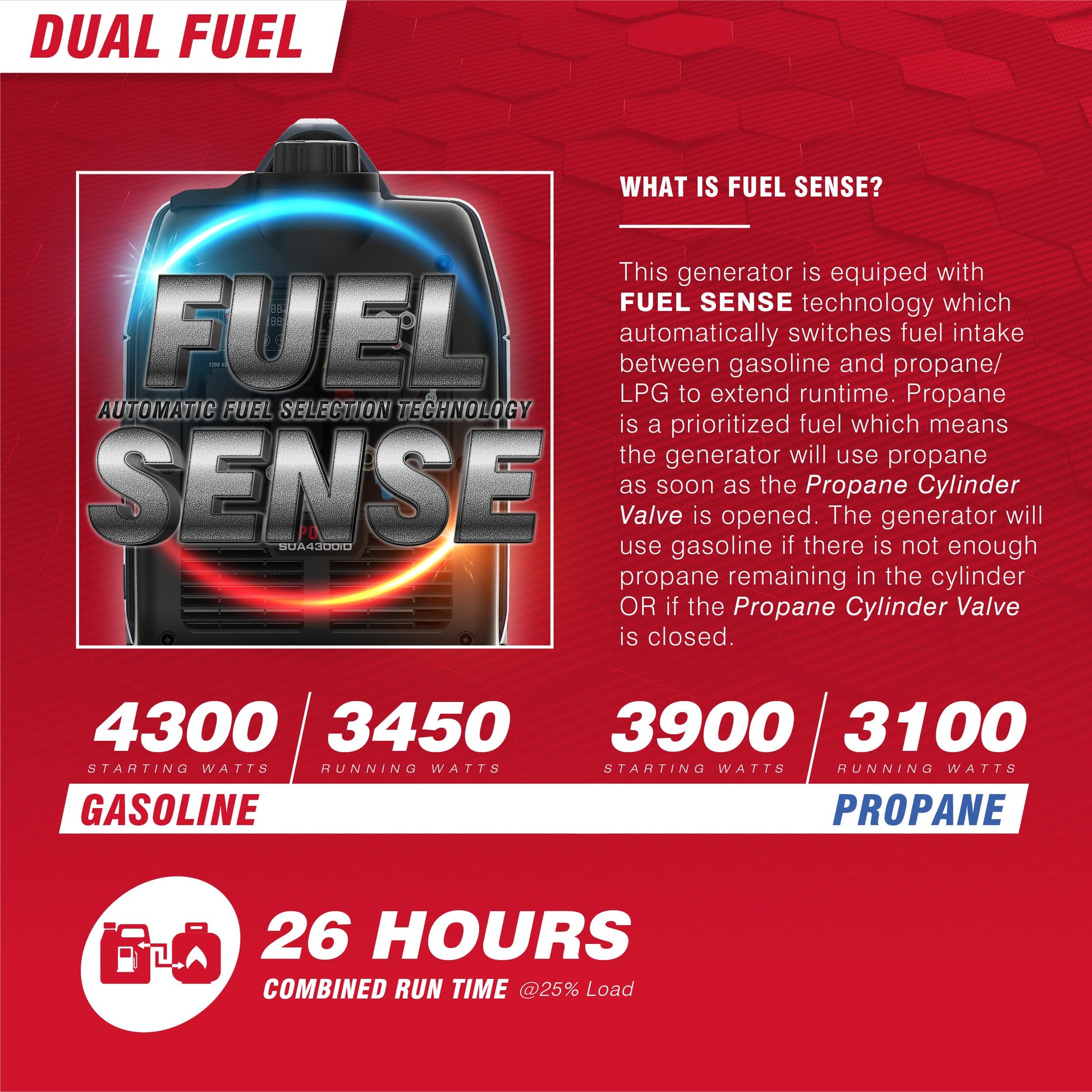 Fuel Sense Technology: Runs on gasoline or propane fuel giving you great flexibility during an emergency. Equipped with fuel sense technology, automatically switches from LPG to Gas for a combined run time of up to 26 hrs at 25% load.