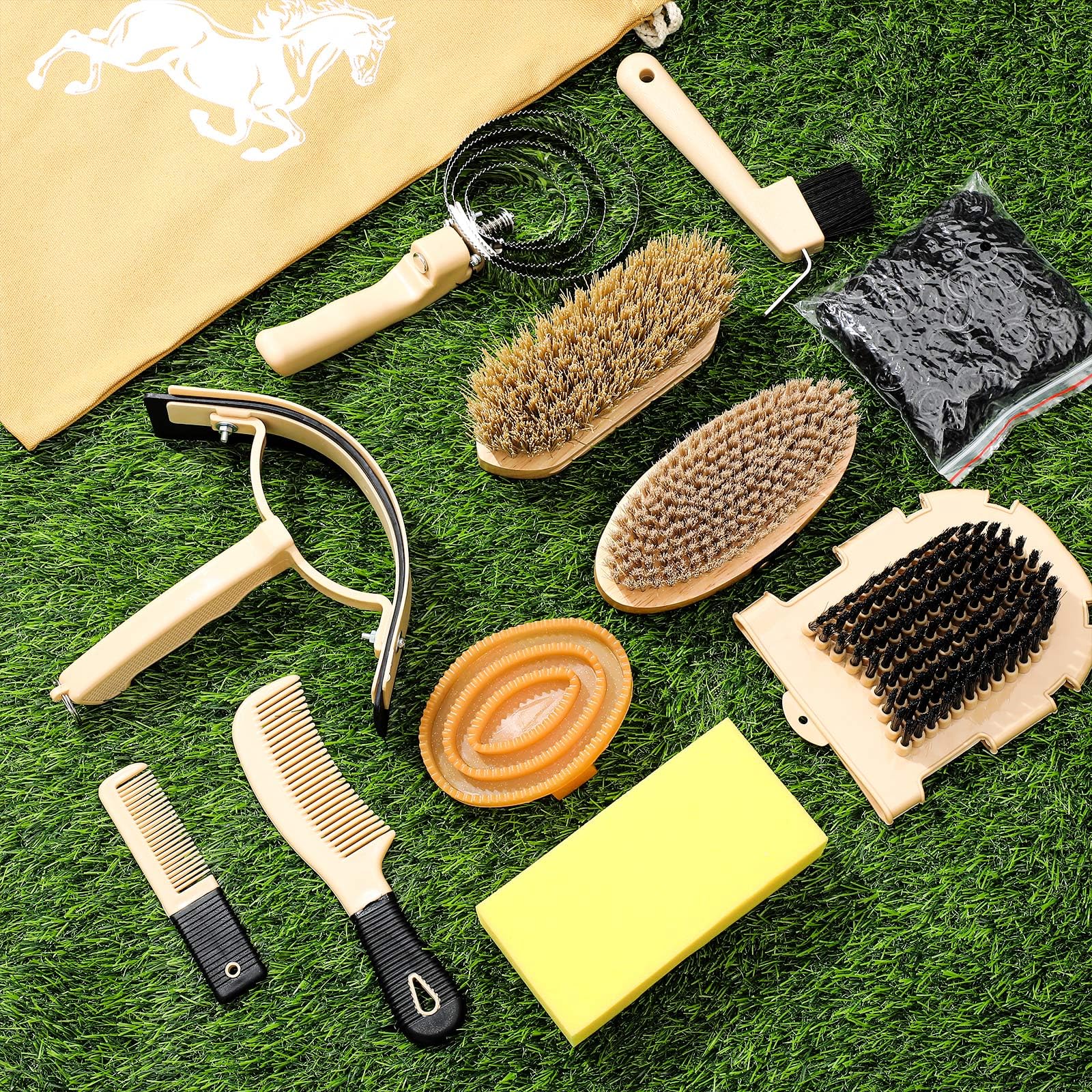 Horse Grooming Kit: this horse grooming set includes storage bag, oval massage brush, hard brush, soft brush, sweat scraper, bath sponge, hoof pick with brush, mane comb, tail comb, rubber band, etc., a total of 12 pieces, such a nice and complete grooming set can satisfy your needs for grooming your horse