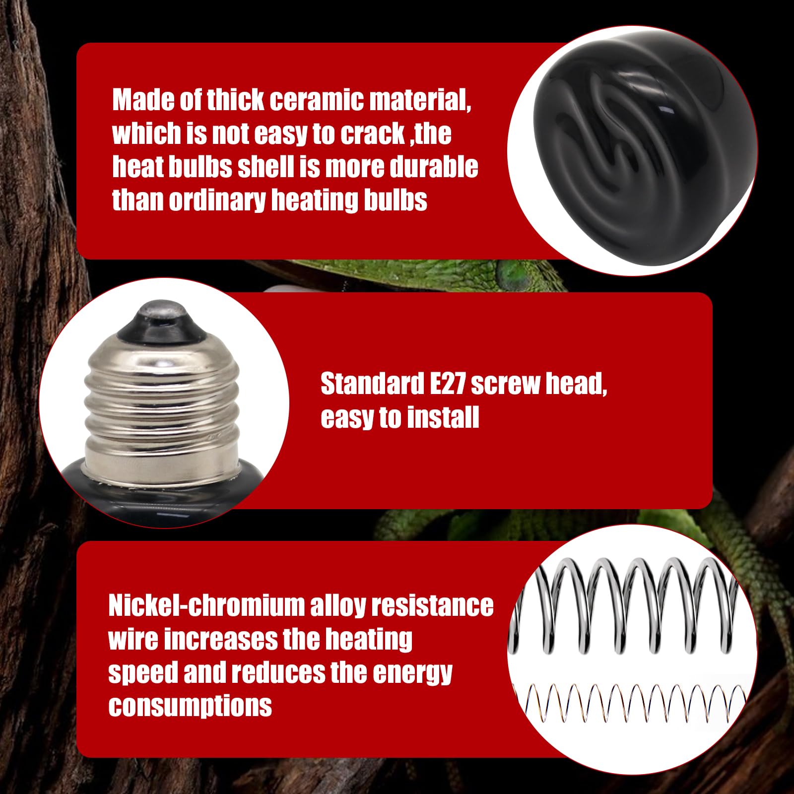 EASY INSTALLATION: with a standard E27 screw head, safe to use in ceramic sockets base, suitable for reptile and amphibian terrariums, poultry coop heaters, snake/turtle tanks and so on!