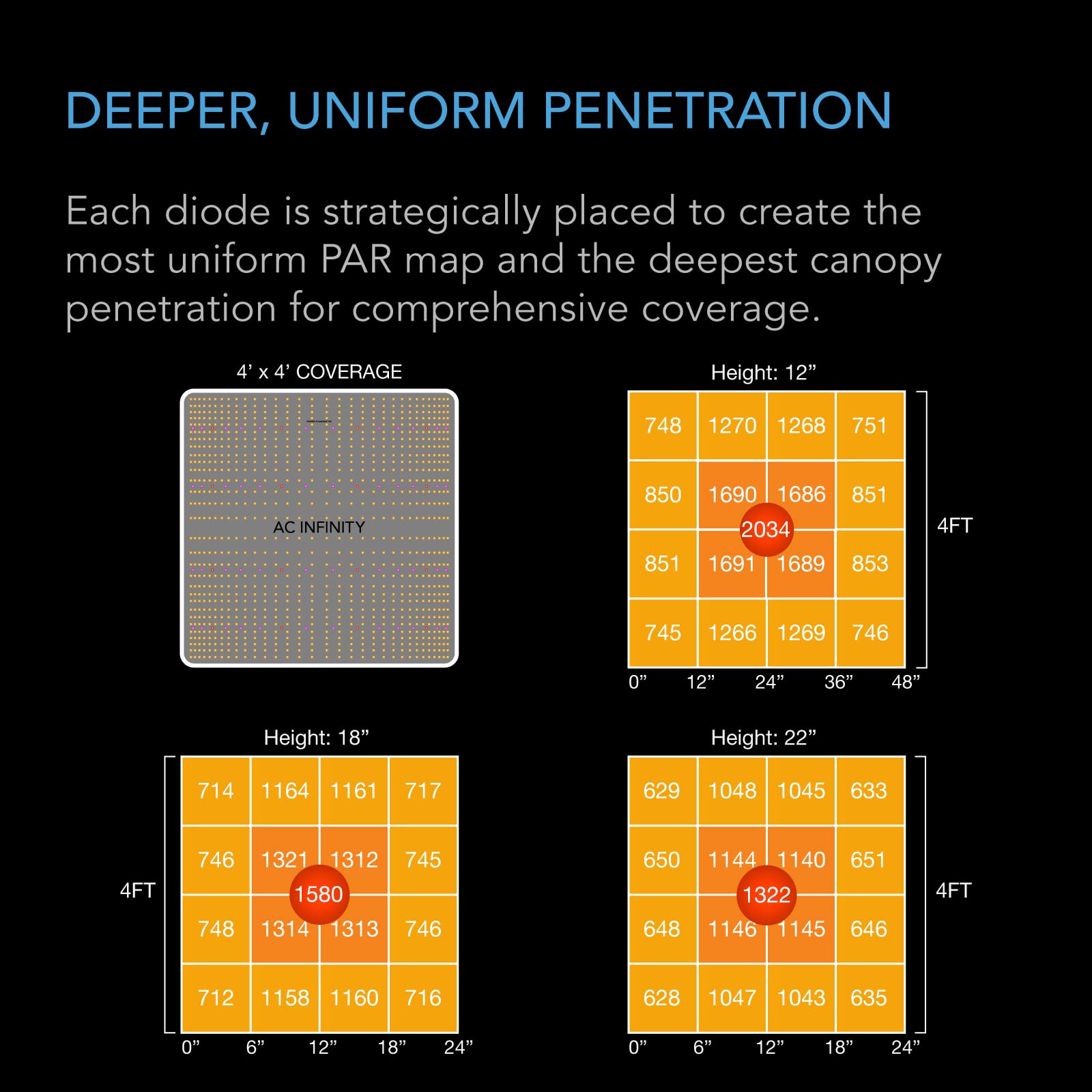 • Algorithmically positioned diodes create the most uniform PAR map and the deepest canopy penetration.