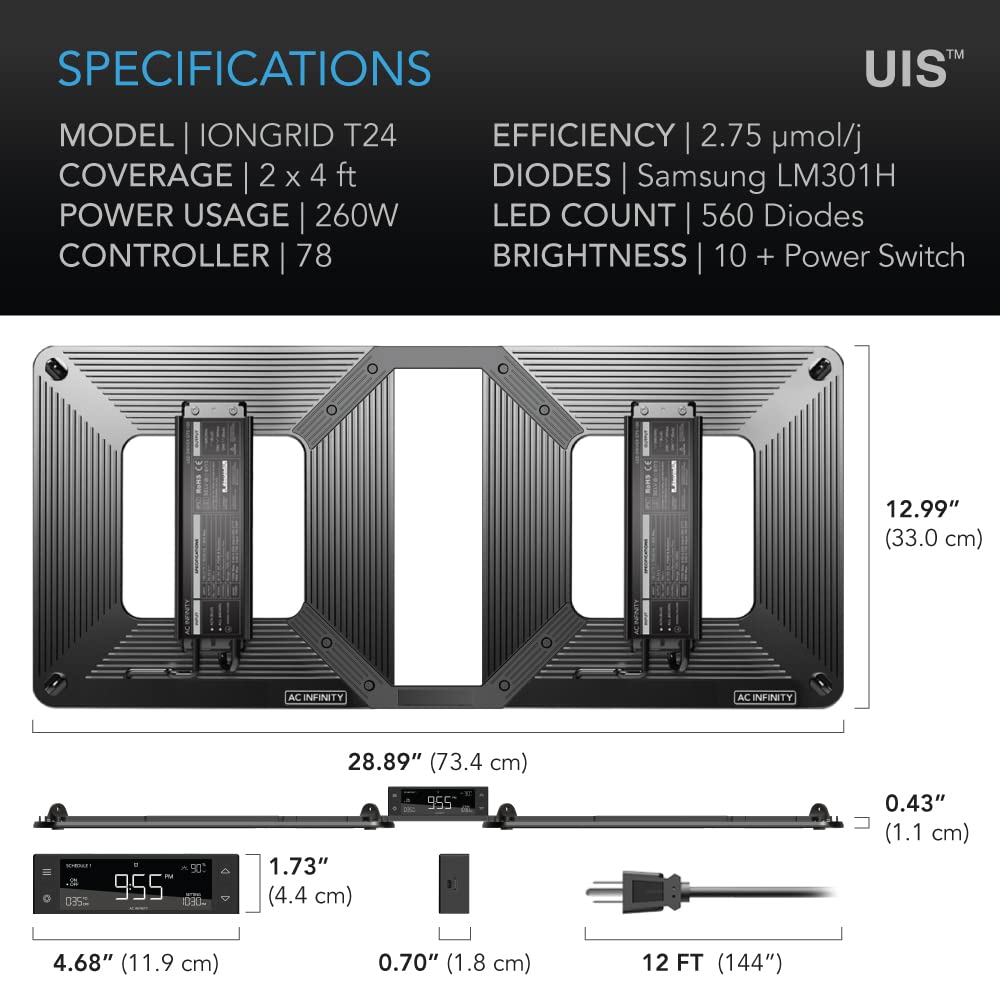 AC Infinity IONGRID T24, LED Grow Light with Samsung LM301H Diodes, Full Spectrum Deeper Penetration Halo Coverage, Digital Dimming Controller, for Veg Bloom Indoor Plants in Grow Tents Greenhouses
