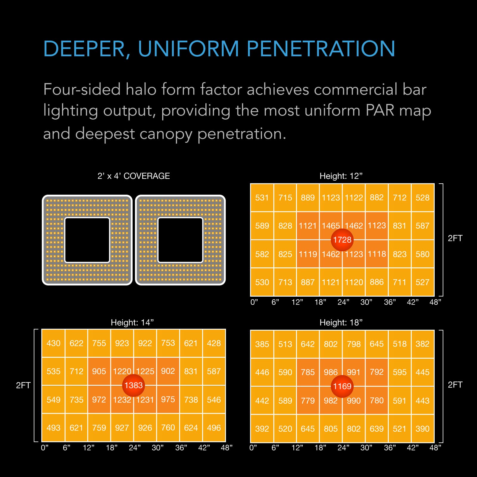• Innovative halo design produces uniform coverage and deeper light penetration to maximize plant yields.