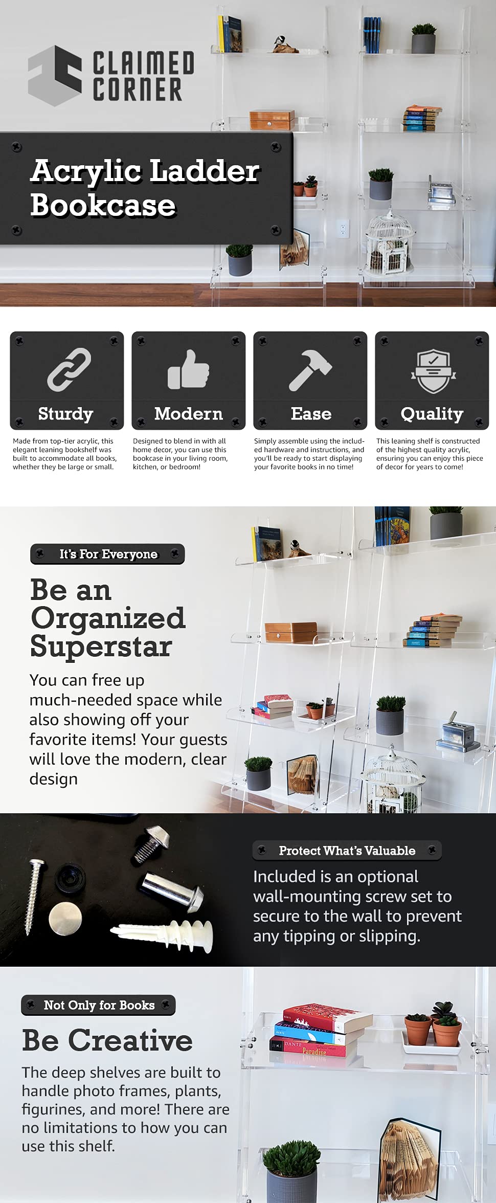 MODERN DESIGN: The Claimed Corner clear acrylic ladder stand is a standout non-wood option that will beautify and expand interior storage space for your living room, home office, study, or bedroom. No need for metal, oak, or rustic alternatives. So clear it looks invisible.