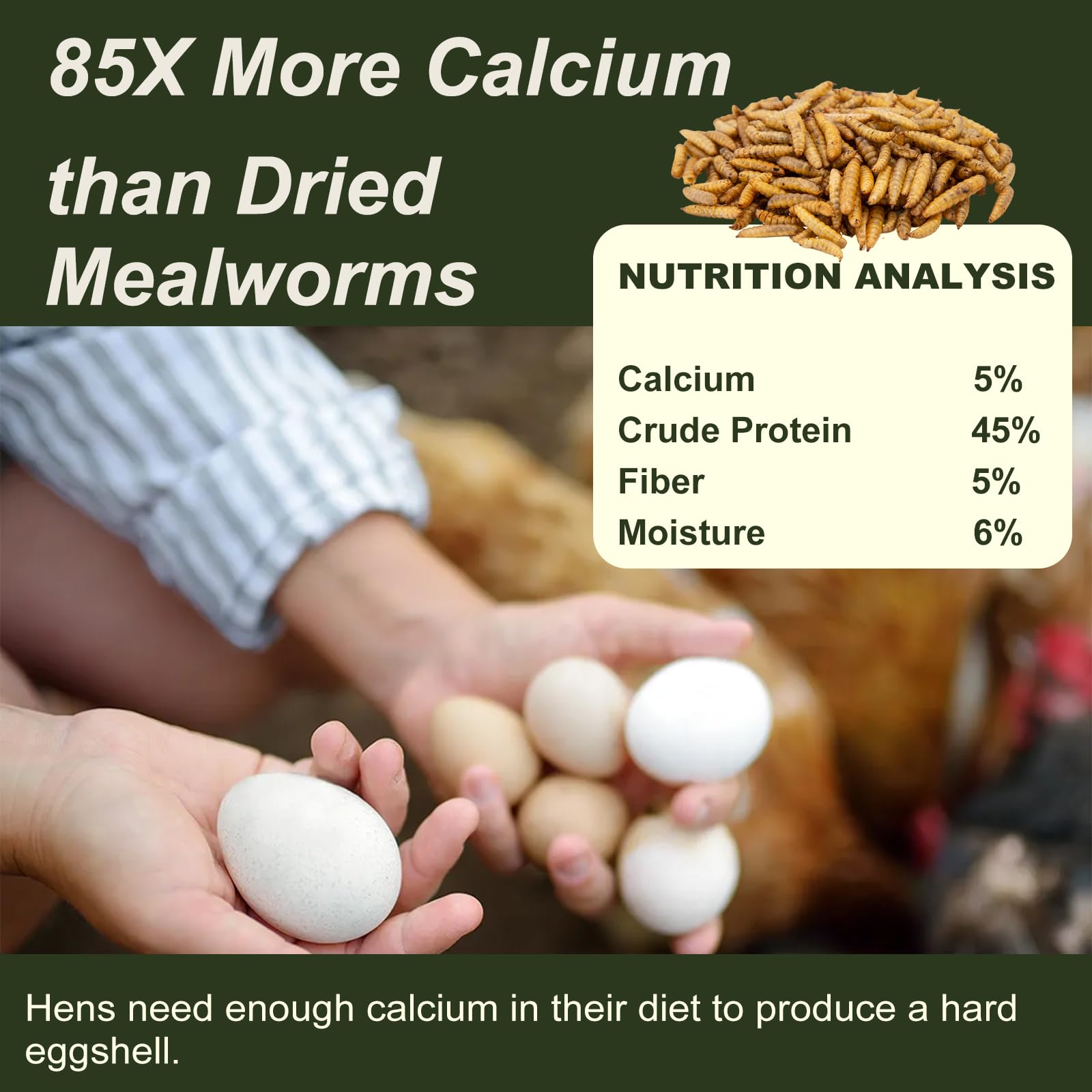 EXCELLENT NUTRITIONAL VALUE: 10 Pound Dried black soldier fly larvae contain up to 45% crude protein, 35% lipids and have an amino acid profile. Black soldier fly larva also contain 85x more calcium than dried mealworms. For a great source of calcium, add 10 pounds of bsf larvae to your chicken feed today.