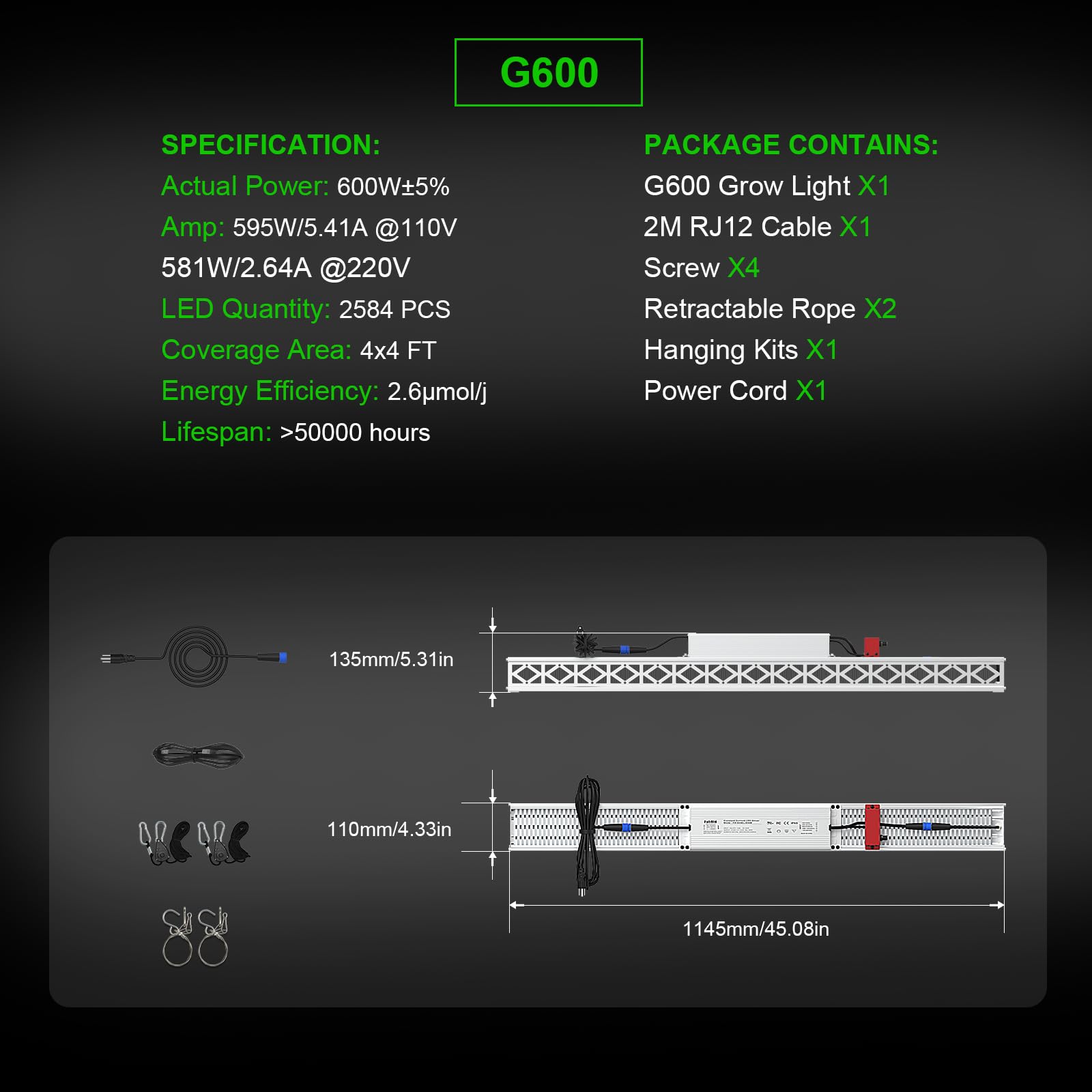 High Efficiency & Performance: Featuring 2584 high-quality diodes, this 600W LED grow light delivers an impressive yield of up to 2.5g/w and a high light output of 1465μmol/s, perfect for a 4x4ft vegetative area.