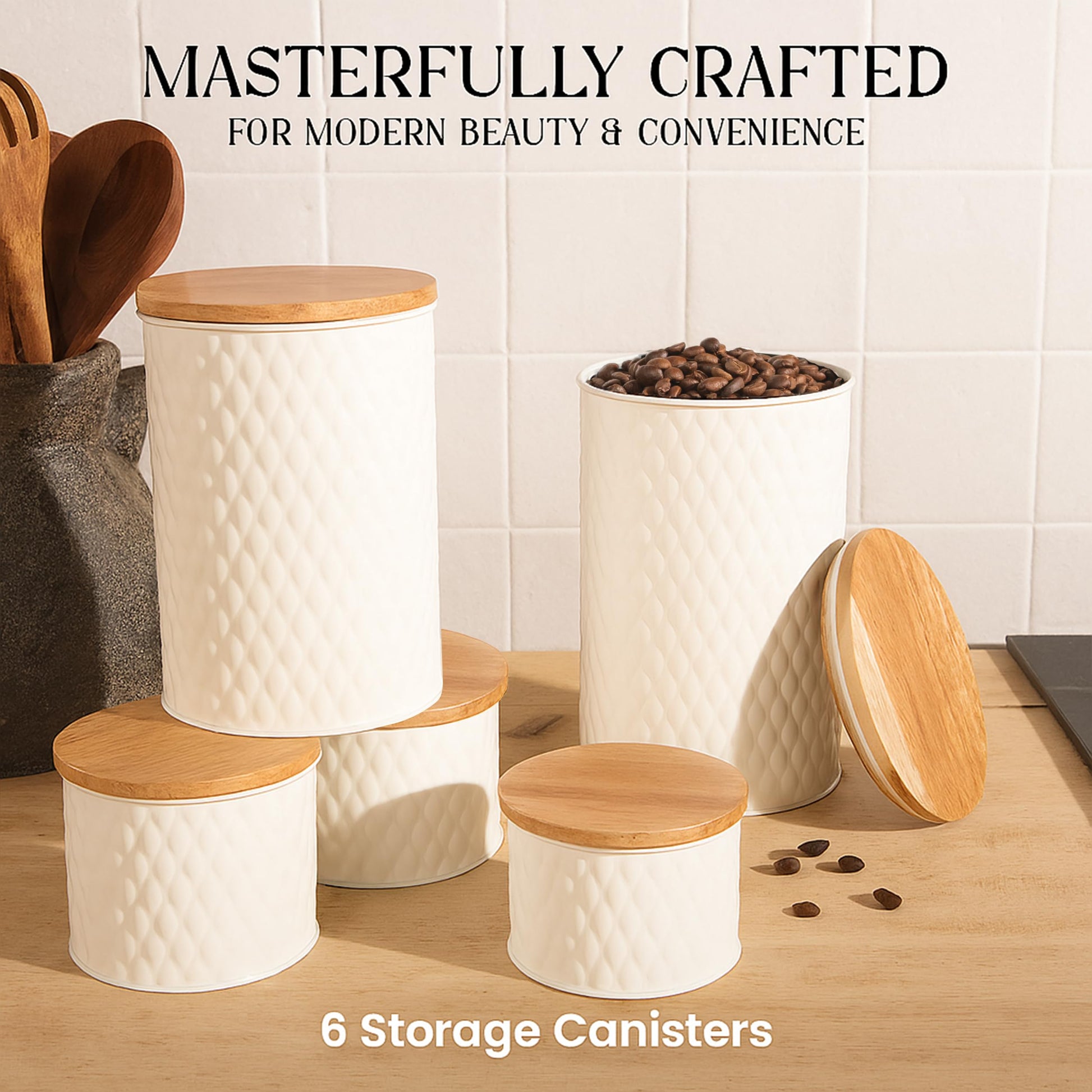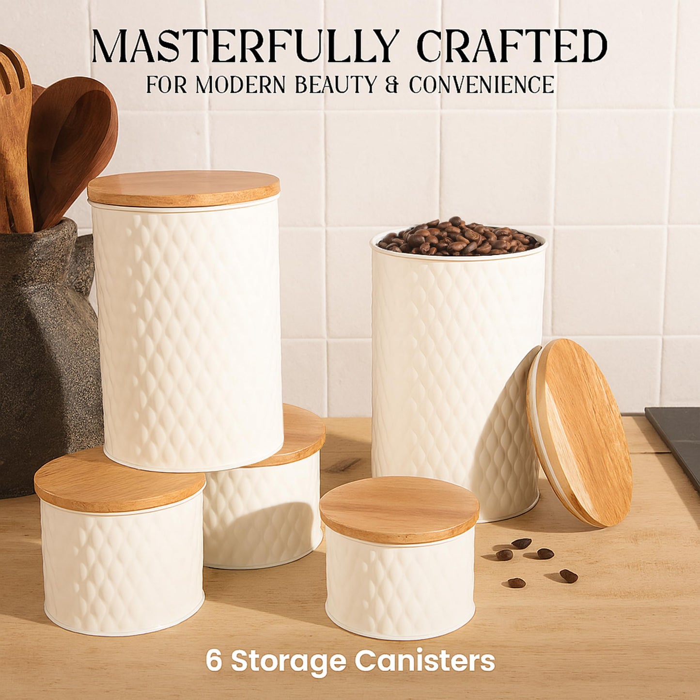 Alasitas 6 Canister Set for the Kitchen Countertop – Metal Food Storage Canisters with Airtight Lids for Flour, Tea, Crafts, Coffee, & Sugar – Container Set with Modern Wood Lids, White