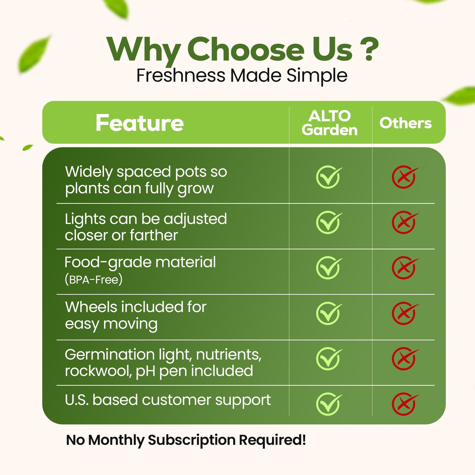 [NO MONTHLY SUBSCRIPTION] Some brands require a monthly subscription to “unlock” the full features of their system. These fees can amount to several hundred dollars per year. With ALTO Garden, there are no hidden fees!