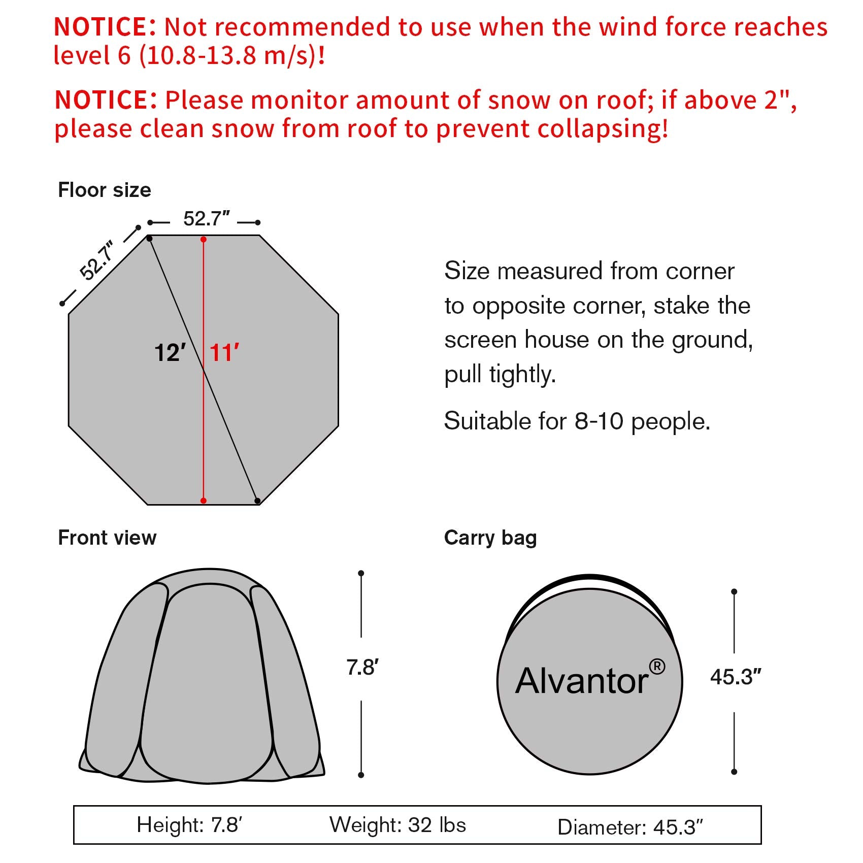 PATENT PENDING PROTECTED ALVANTOR DESIGN: This winter screen house measures at (Width: 12’, Depth: 12’, Height: 8’) and comes with a compact carry bag. Weighing just 32 lbs, this pop up igloo tent has a innovative folding technique making it easy to fold down and store back in the carry bag. Ready to go in minutes!