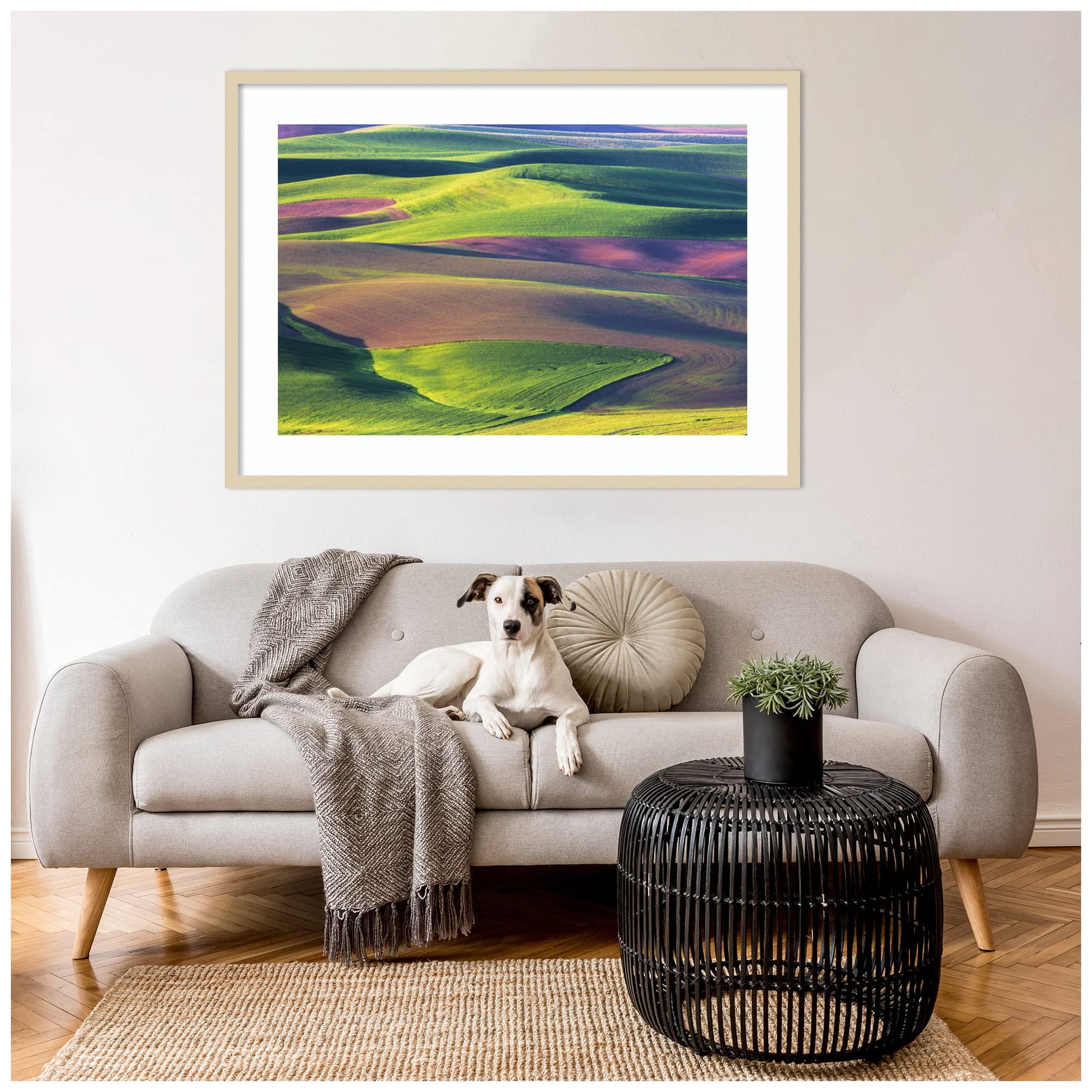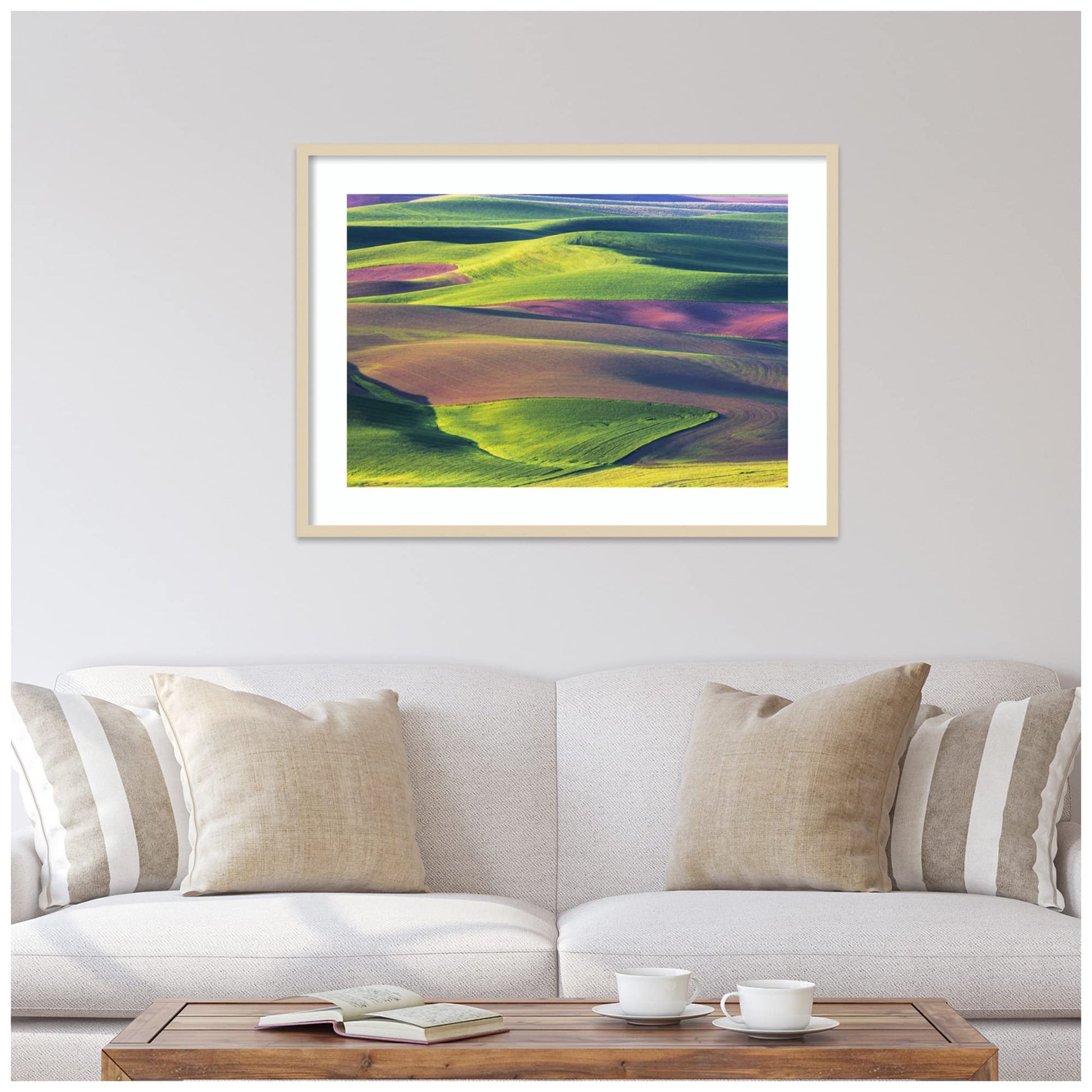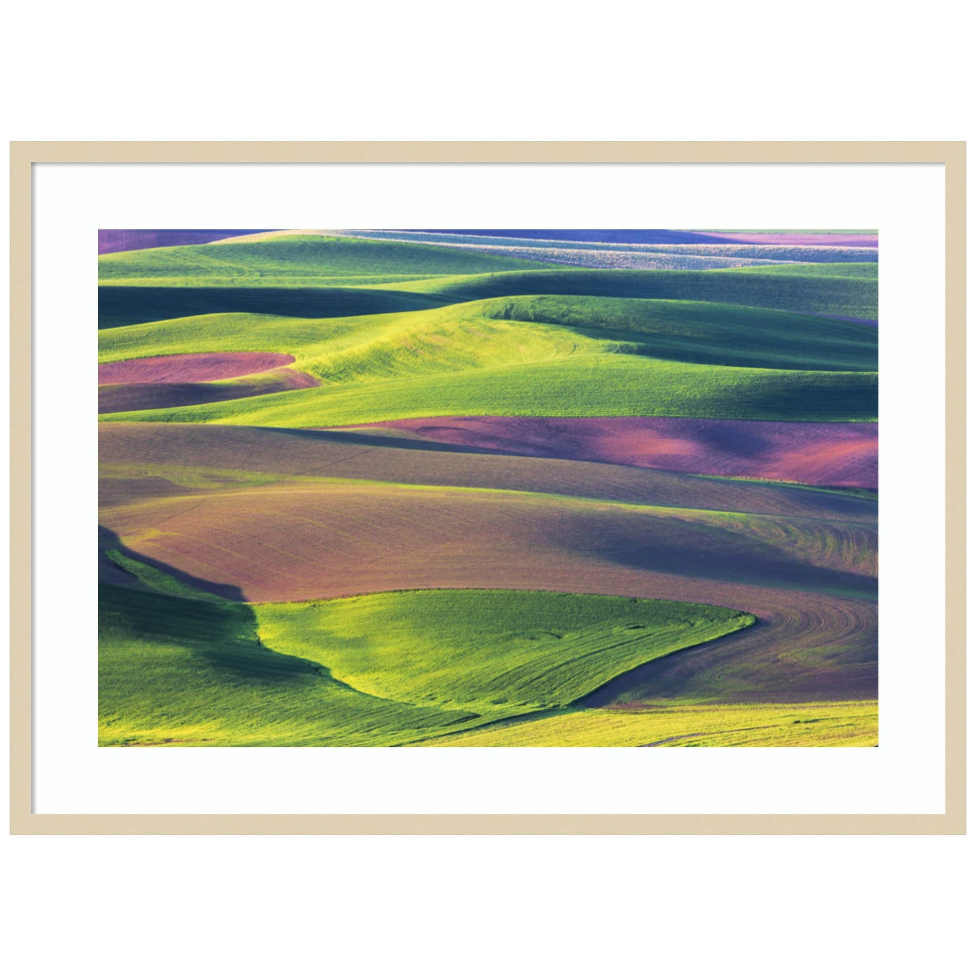 CUSTOM ARTWORK DETAILS: USA, Washington State, Palouse, Spring Rolling Hills of Wheat fields by Terry Eggers Danita Delimont; ART DESCRIPTION: Rolling fields of wheat are captured from above in this bright and colorful photograph taken in Washington state. Browns, greens, and purples dance across the photo displaying the absolute beauty and grace of our beautiful world. Terry Eggers has been photographing for the over 30 years. He specializes in nature, wildlife photography and travel, but his files cover a wide variety. In addition Terry markets his work to many calendar companies.