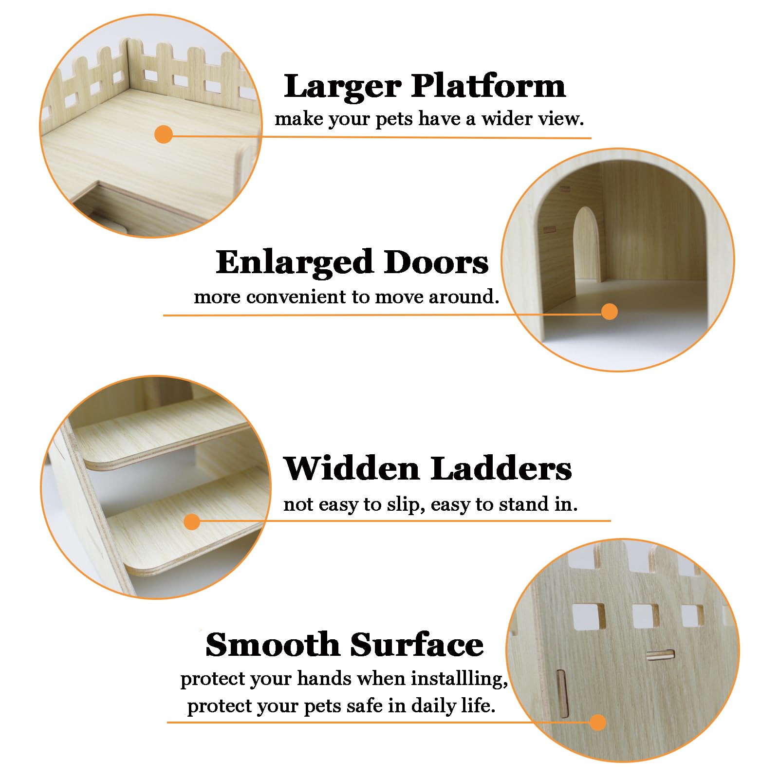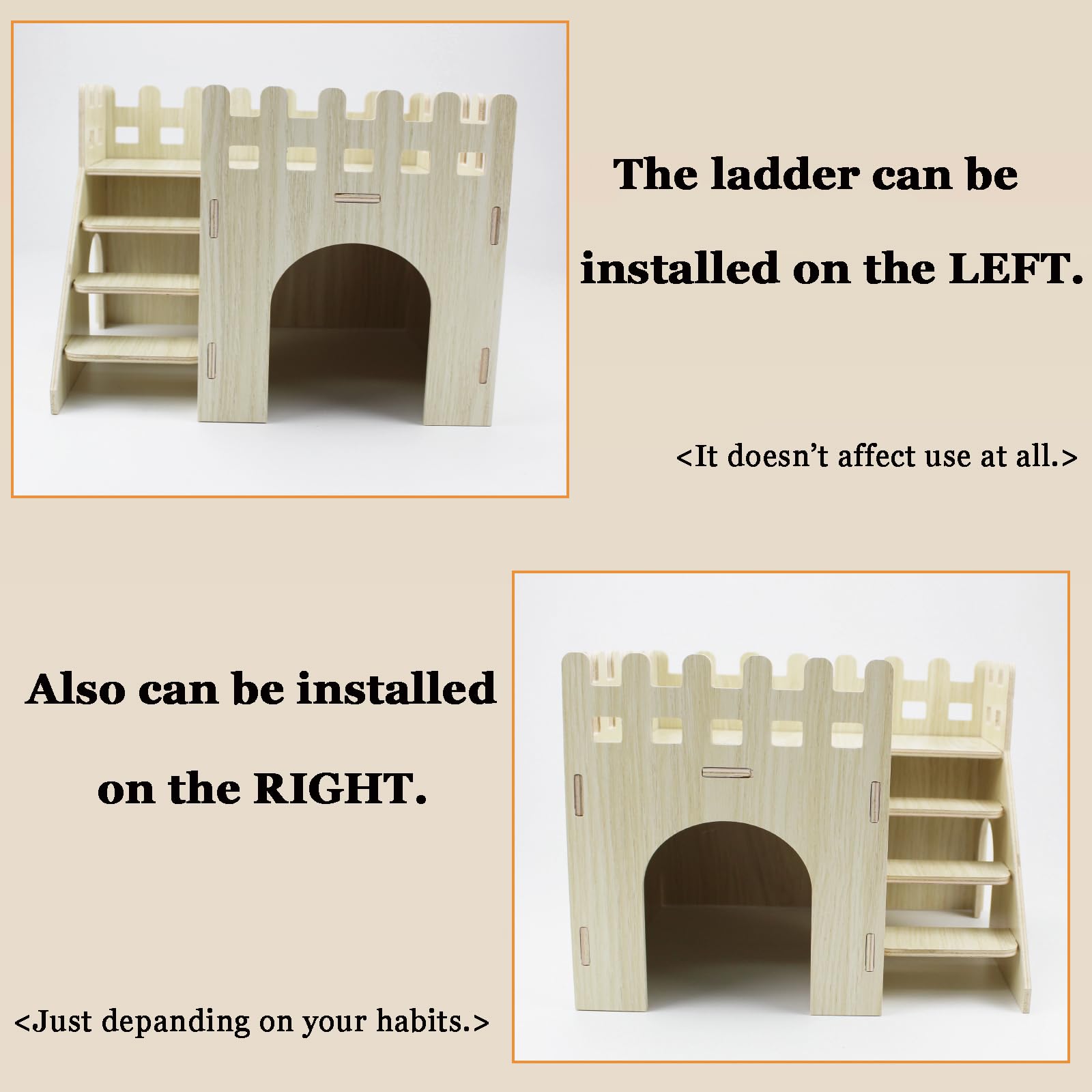 【Well-Made and Unique Design】 The wooden hamster hideout has a clean burr-free cut surface and every corner is polished smooth. The wide ladder and roof are freely to climb and play for small animals, the door opening is also large enough for small animals to enter and exit freely.