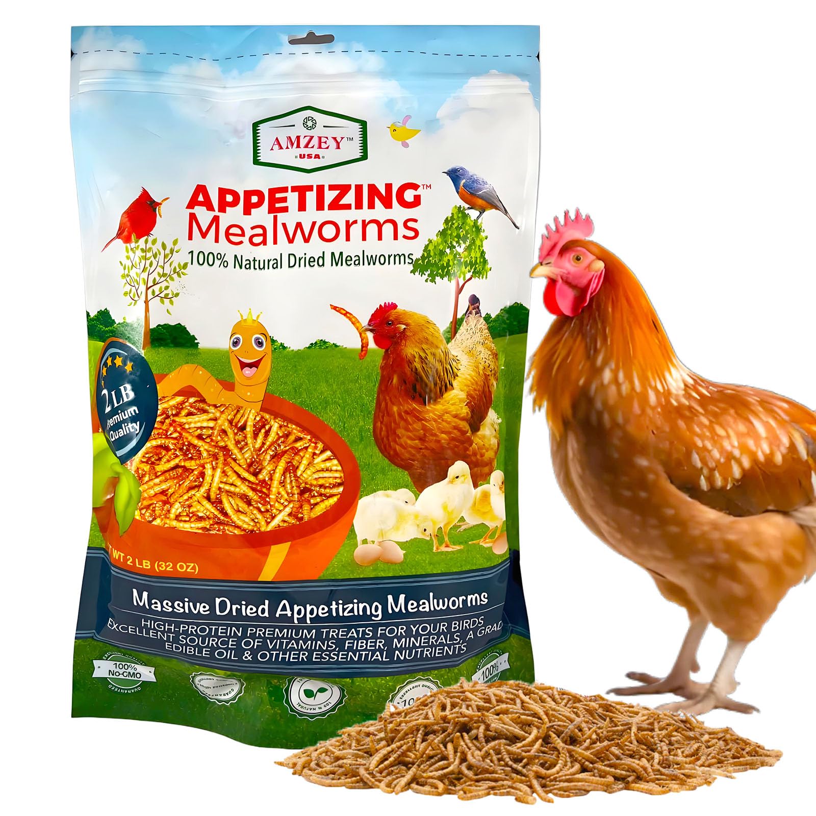 SUPERIOR QUALITY - Our mealworms is BIG, THICK, and JUICY. High protein Chicken feed, premium treats with an excellent source of vitamins, fiber, and minerals. Non gmo chicken feed, poultry feed. CONVENIENT PACKAGING: 2 LBS of Dried Mealworms pack in a top resealable zip bag for easy opening and closing, no refrigeration required.