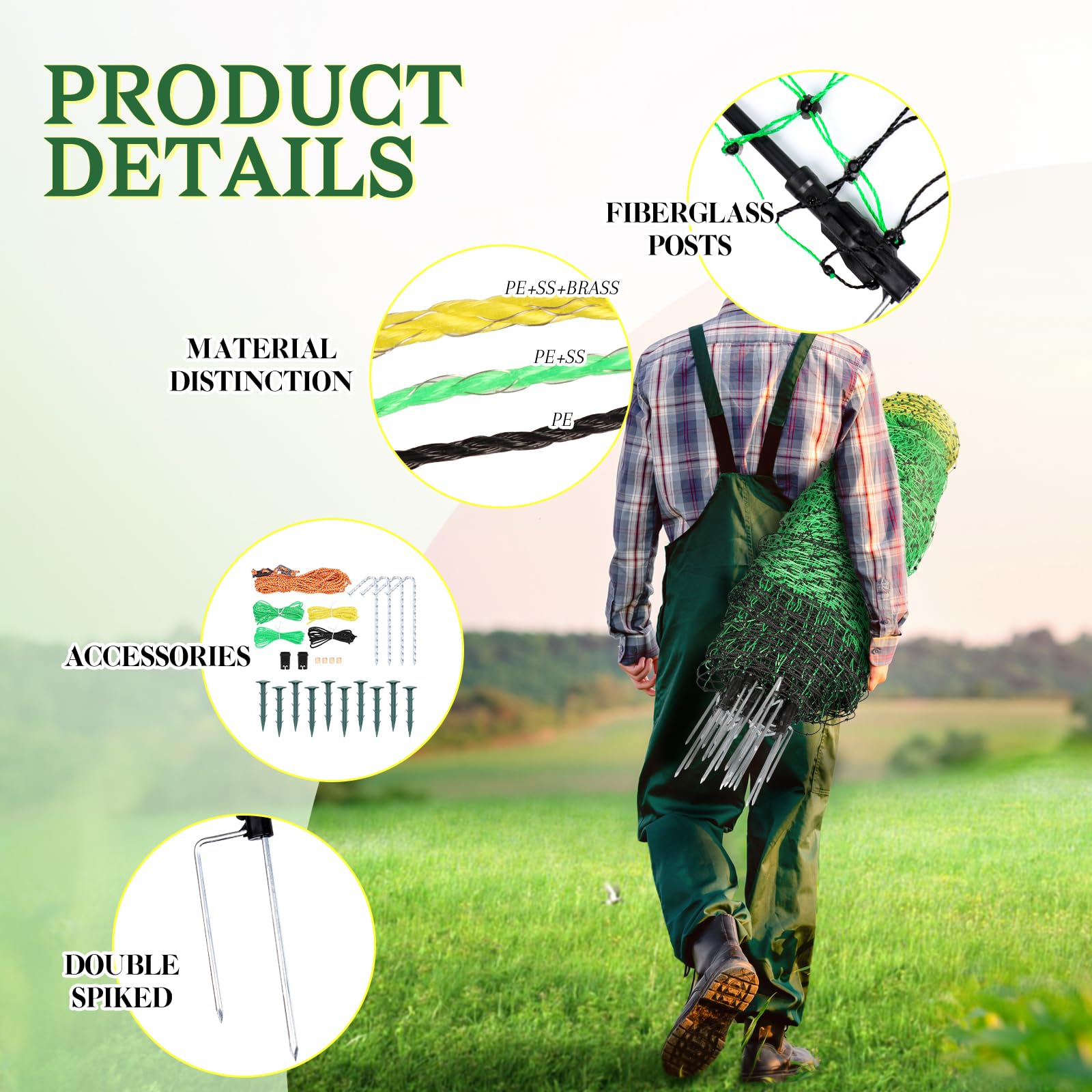 ROBUST ELECTRICAL CONDUCTIVITY: The 48” H × 164' L Electric Poultry Netting, equipped with 14 horizontal strands (12conductive), and a vertical line every 3 inches, ensuring powerful electrical conductivity to provide reliable protection for poultry.