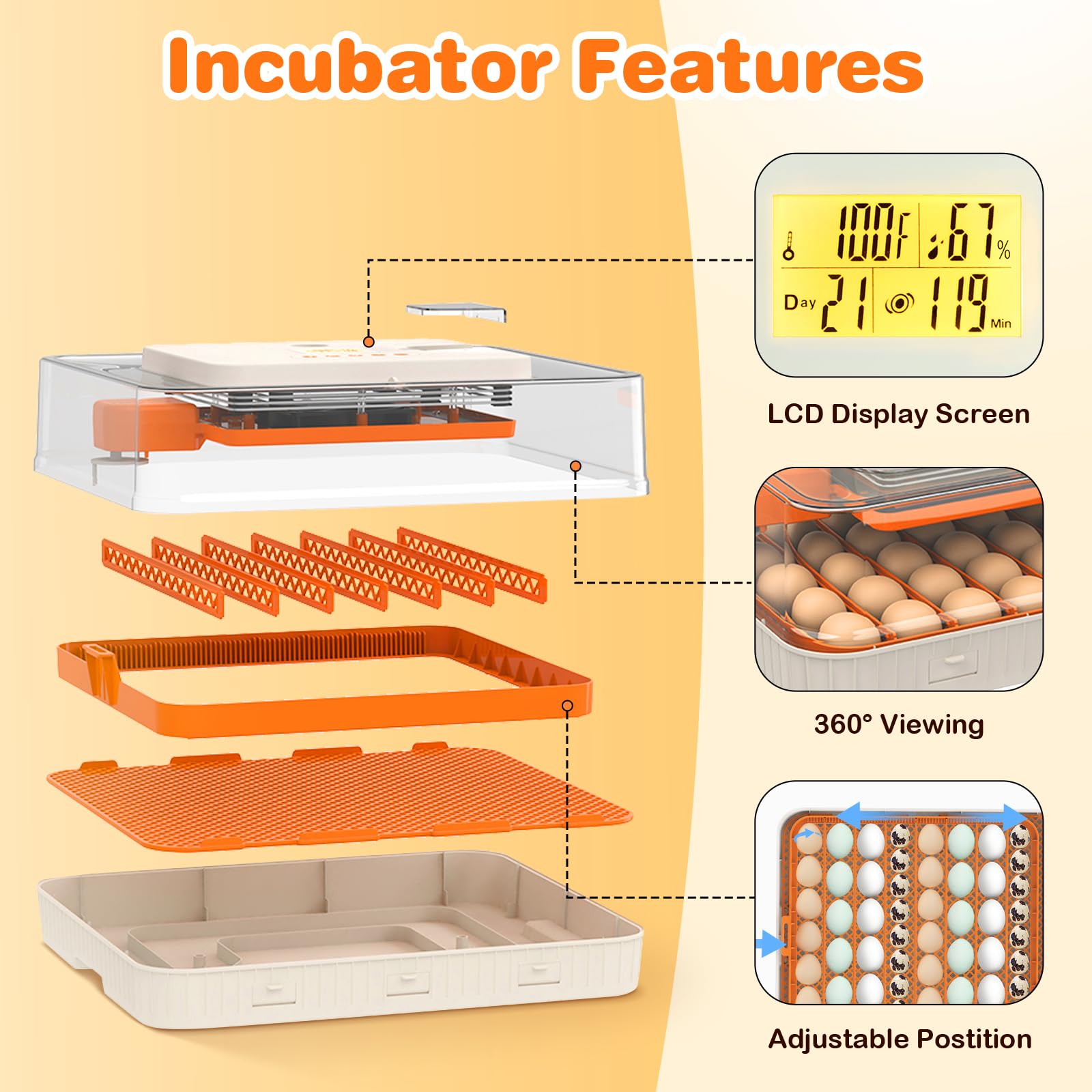 Egg Candler & 360° Viewing: Our chicken egg incubator is equipped with a visual egg candler lighting on top of the egg incubator, convenient to observe the hatching progress and check egg's condition. Features a 360°transparent lid for non-intrusive observation