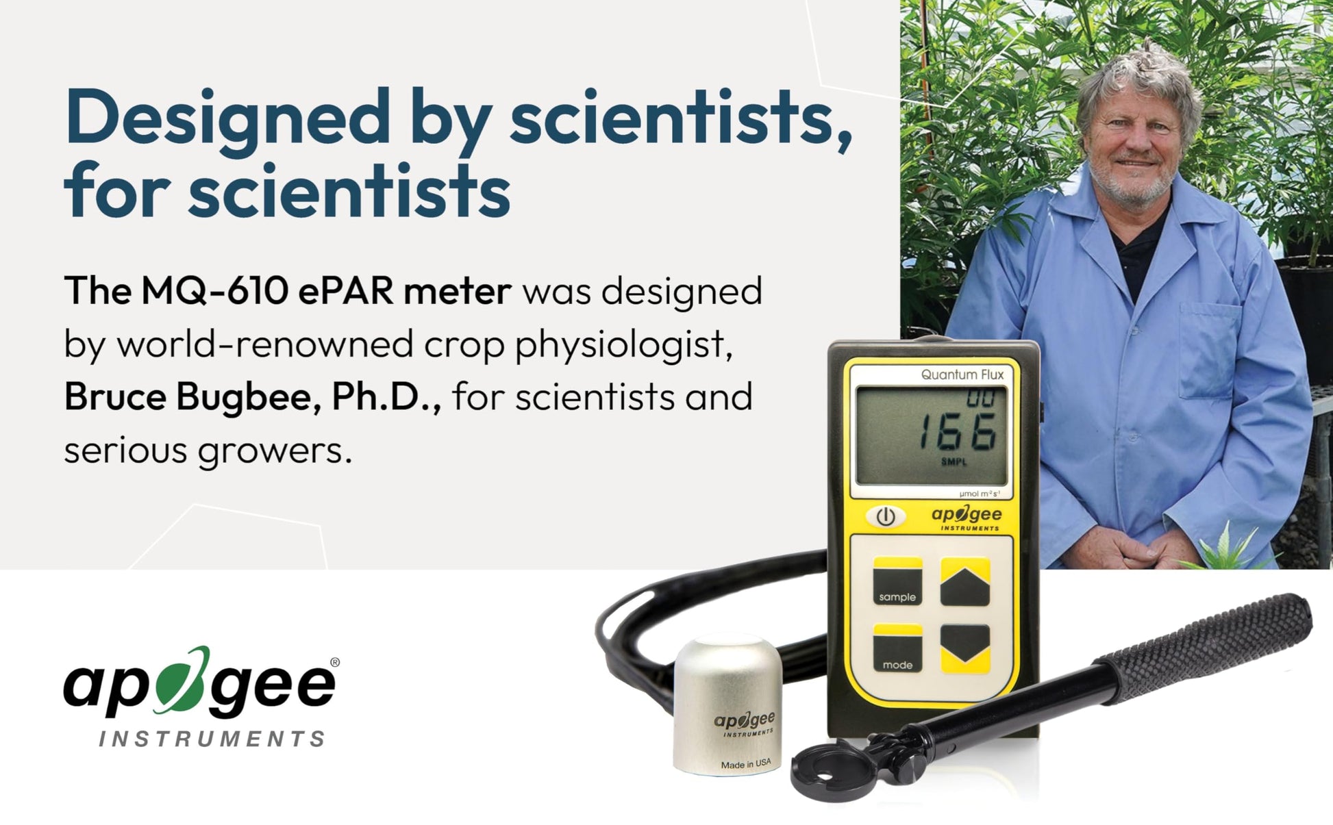 DR BRUCE BUGBEE: Apogee PAR meters have been designed and refined by Dr. Bruce Bugbee, a world-famous crop physiologist.