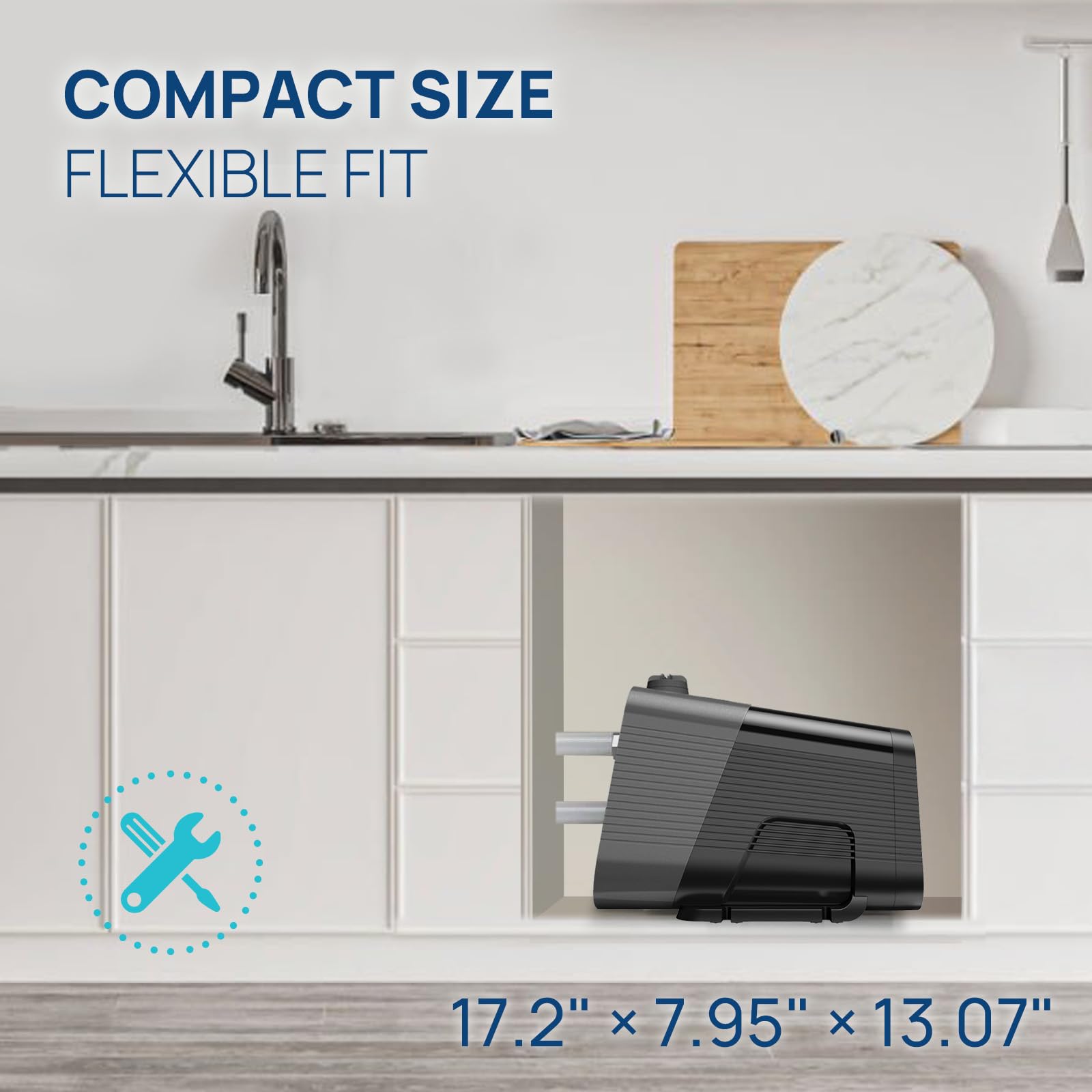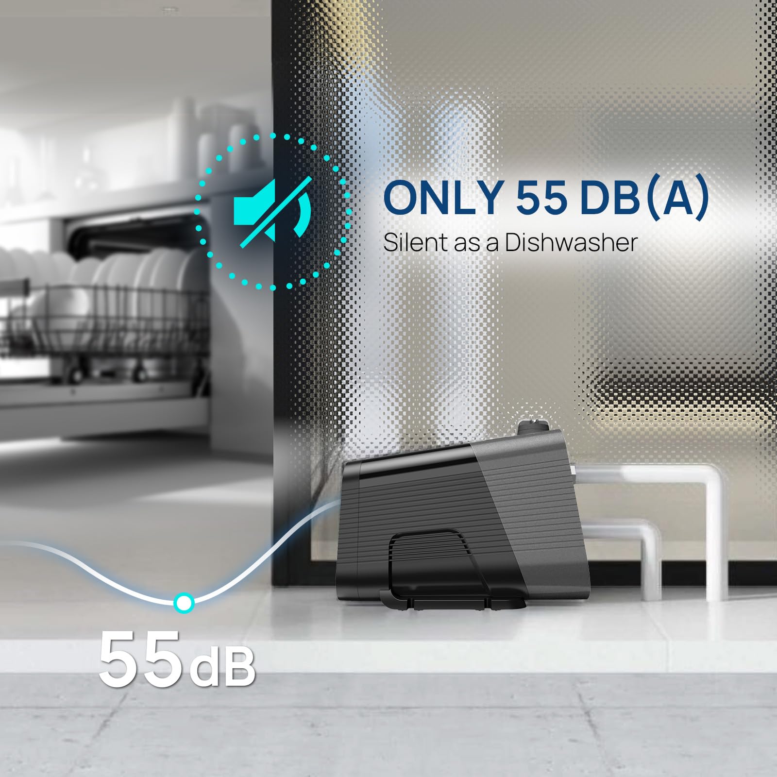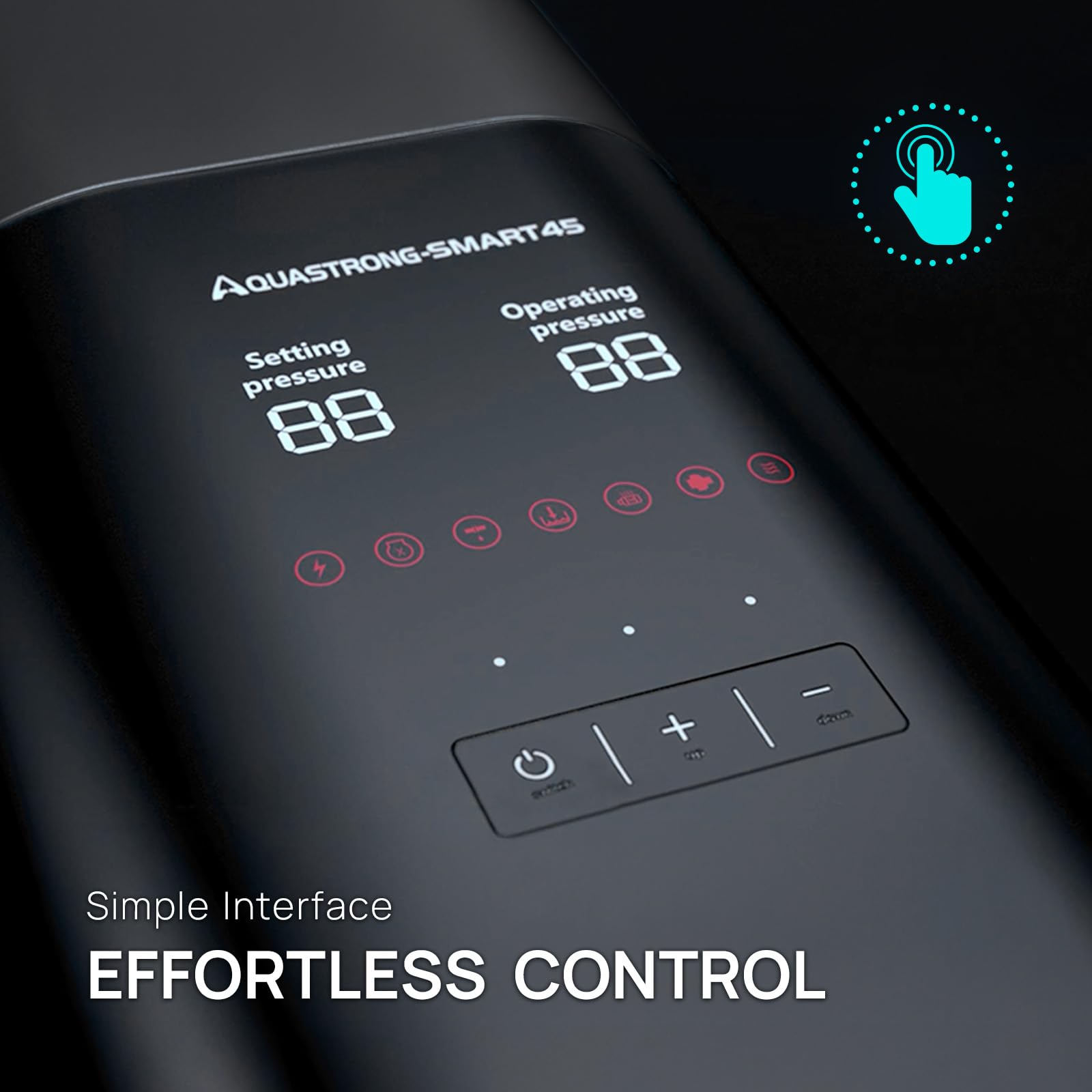 Adjustable Pressure & Speed: Smart 45 is a fully integrated and intelligent water pump designed for domestic boosting. It automatically monitors and adjusts performance according to water demand, ensuring perfect pressure at your faucets. The smart pump control maintains constant pressure across all taps in the house, with a maximum flow rate of 1500 GPH and a maximum head of 150 ft. The pressure setting range is 1.5-5.5 bar (22-80 PSI), with a preset of 3 bar (44 PSI).