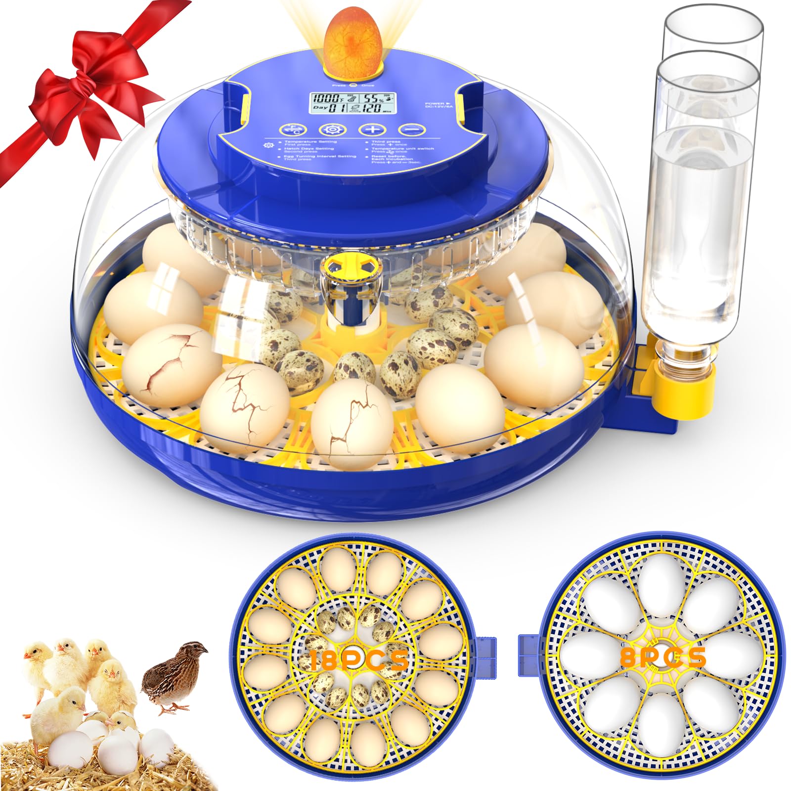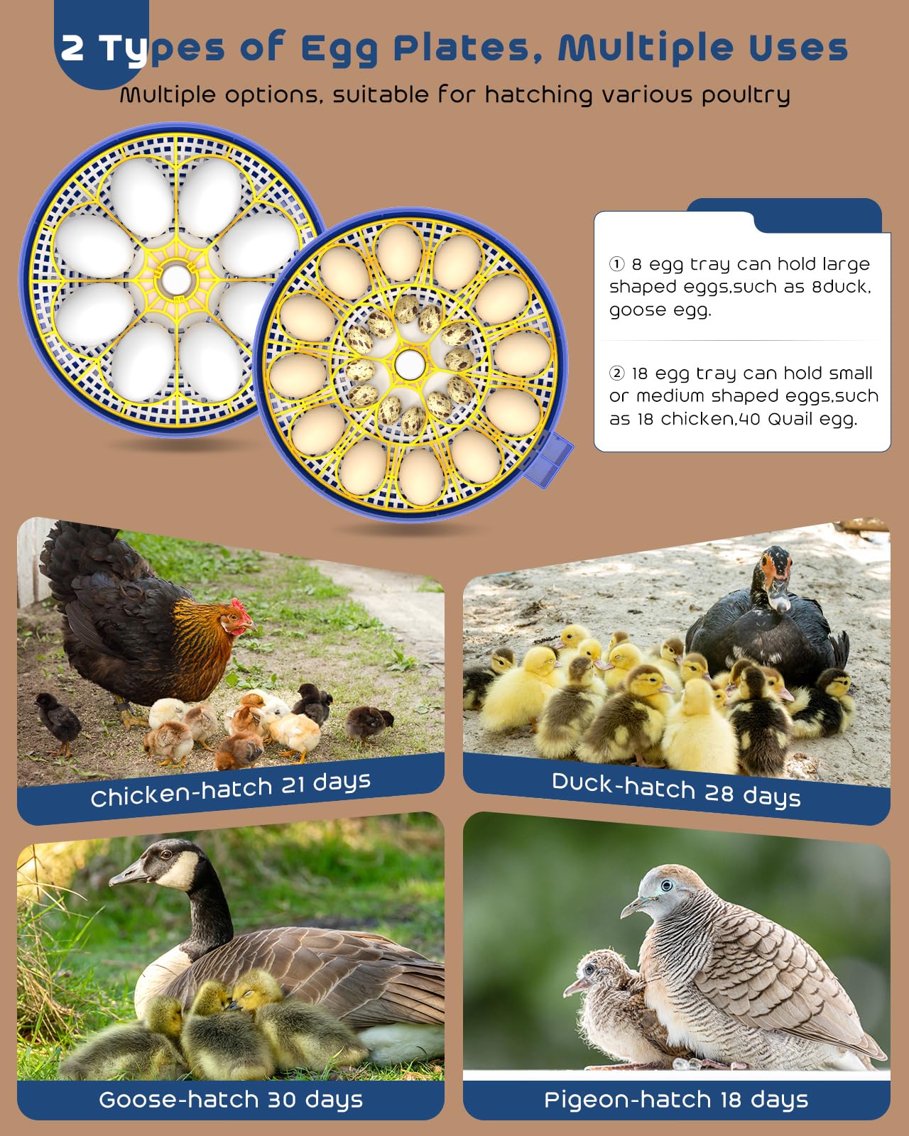 - π¦γπ½ππππππππ π«πππππ π¬ππ π»πππγ- AsFrost farm innovators incubator features two interchangeable egg trays (18 eggs small tray and 8 eggs big tray) for hatching all kinds of poultry and critters, such as chicken, duck, turkey, quail, pigeons, and mysterious reptiles, etc, meeting diverse incubation needs. With a larger interior space, accommodating up to 18 chicken eggs at a time, 8 goose eggs or more than 40 bird eggs, with ample room for chicks after they hatch. Perfect for both beginners and experts, an ideal gift for poultry enthusiasts.