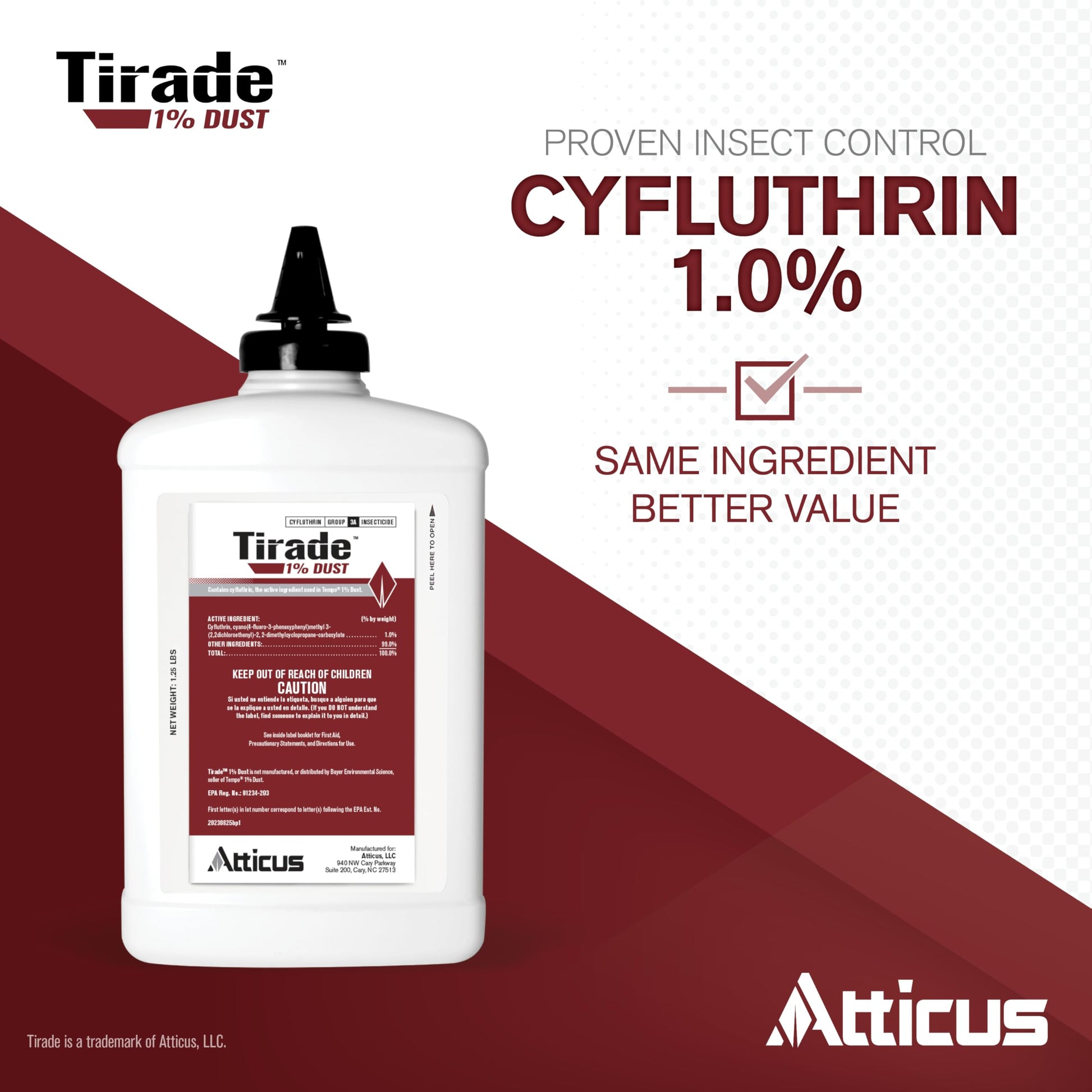 POWERFUL BROAD-SPECTRUM CONTROL: Tirade 1% Dust contains cyfluthrin, the same active ingredient as the leading brand, to control flying, crawling, and wood-infesting insect pests.