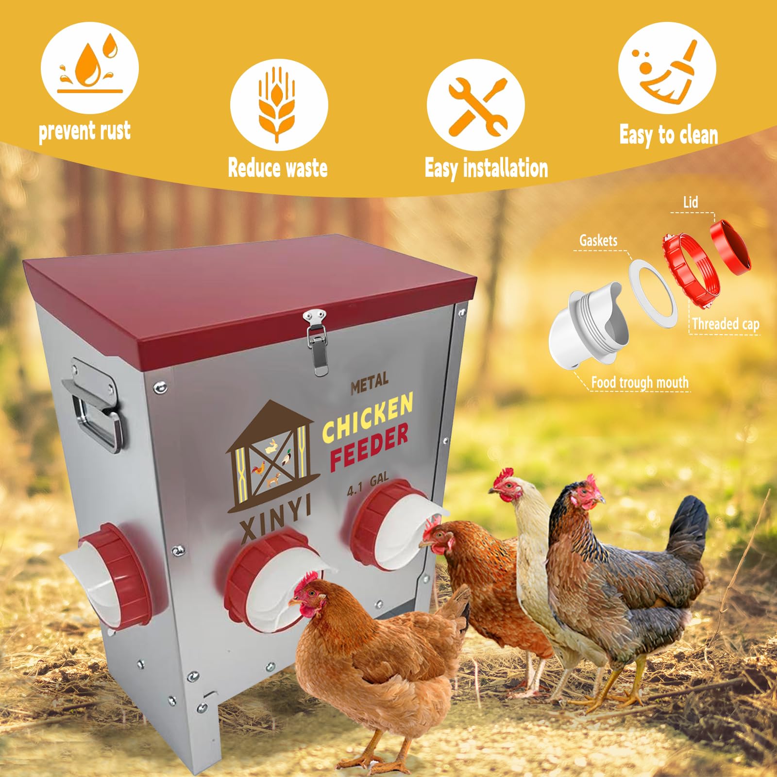 Metal Chicken Feeder:This automatic chicken feeder is made of galvanized steel plate, which is durable and can with stand the test of harsh outdoor weather, is not affected by the scorching sun and wind and rain.