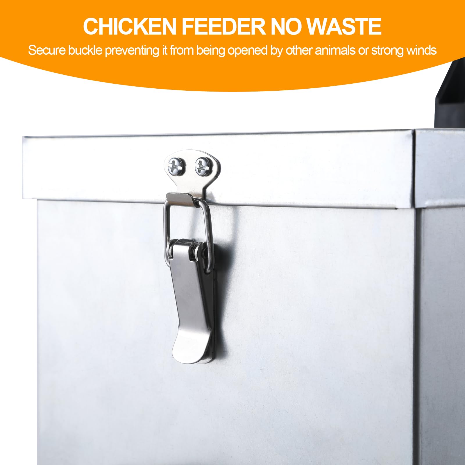 【No-Waste Design】This automatic chicken feeder comes with a cover and latch to solve the problem of other animals stealing food; The automatic gravity mouth design effectively reduces feed spillage and No mess, keep it clean and save on feeding costs!