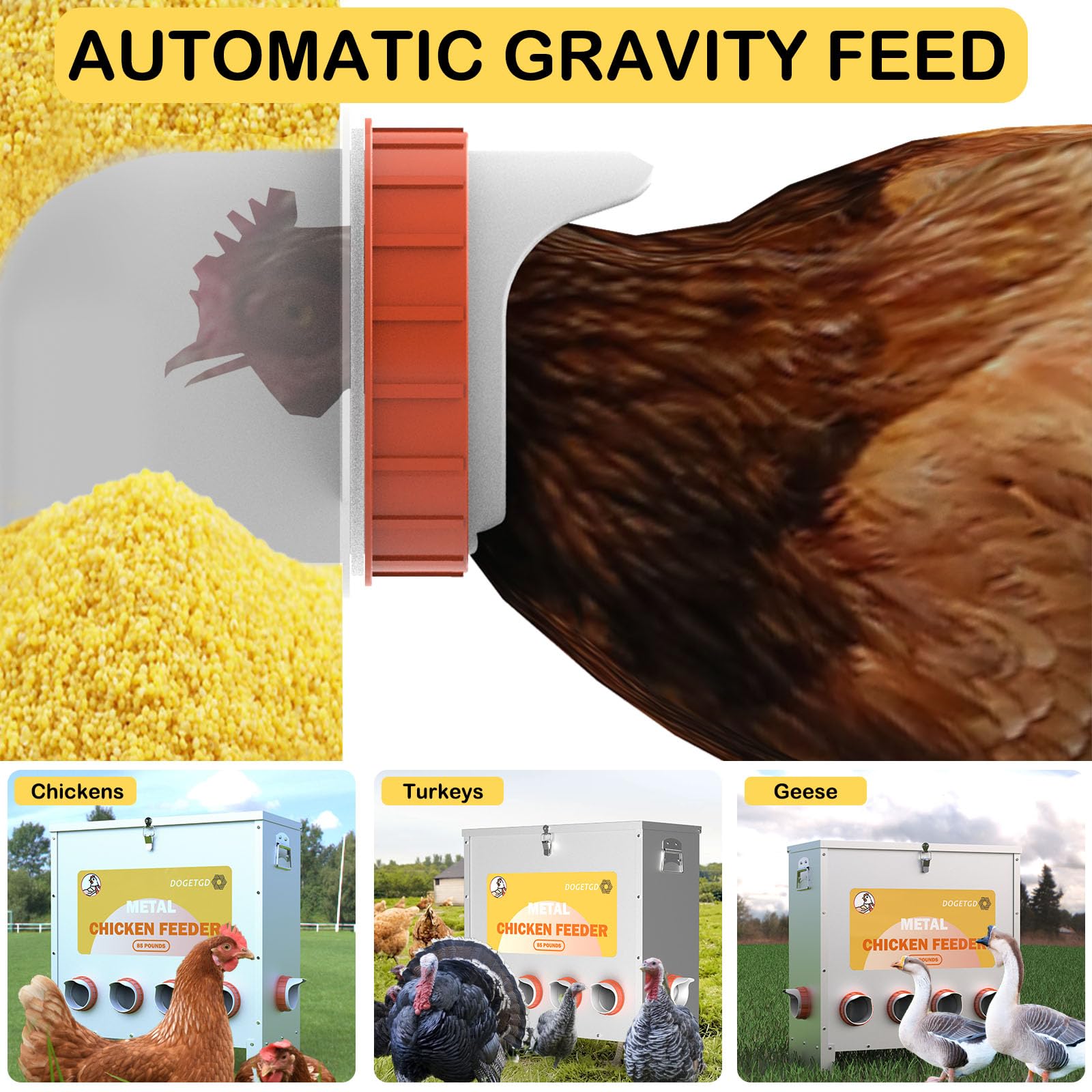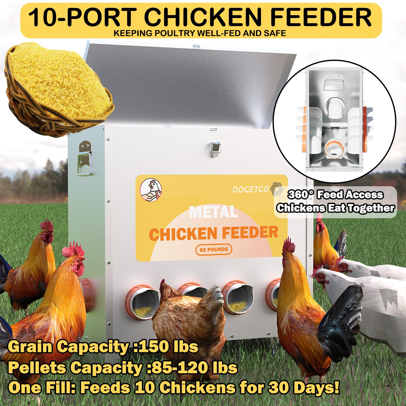 Automatic Chicken Feeder No Waste Metal Poultry Feeder Large Capacity 85lbs for Chickens, Geese, Ducks, Turkeys, Quails (10-Port)