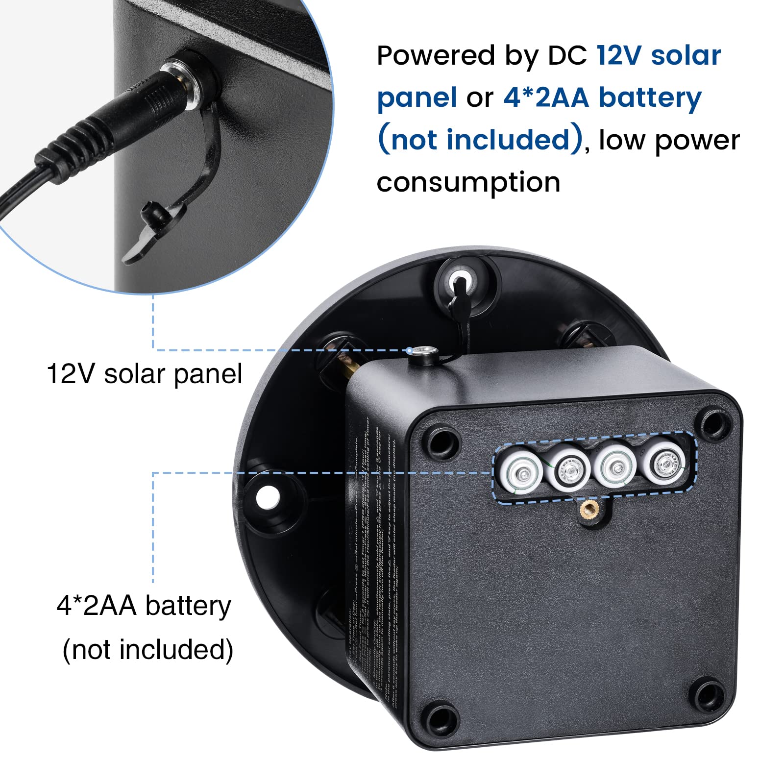 TWO POWER OPTIONS: You have the flexibility to energize your feeder using a 12-volt solar panel (sold separately) or with 4*2AA batteries (not included). With ultra-low power consumption, it ensures an extended service life. Additionally, a low battery indicator on the screen prompts you to replace the batteries promptly, preventing feeder failure