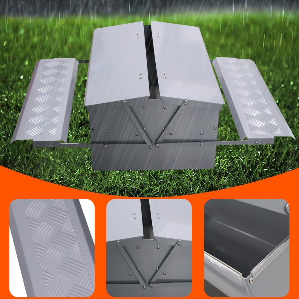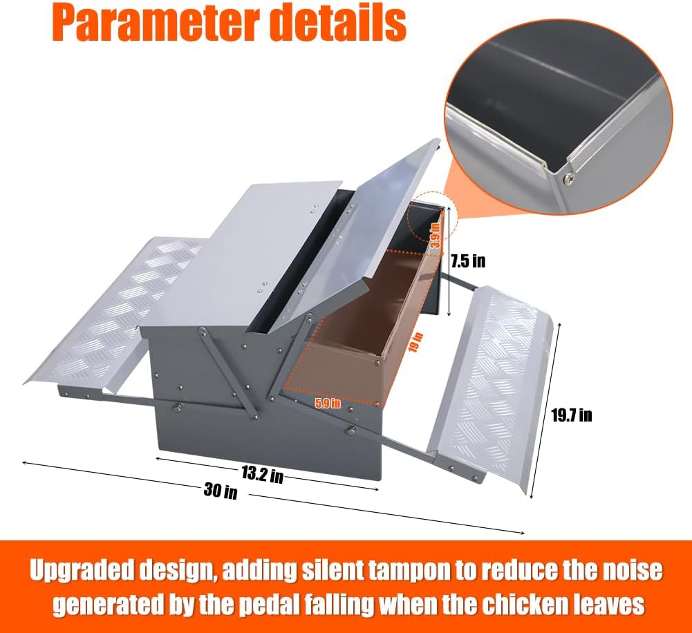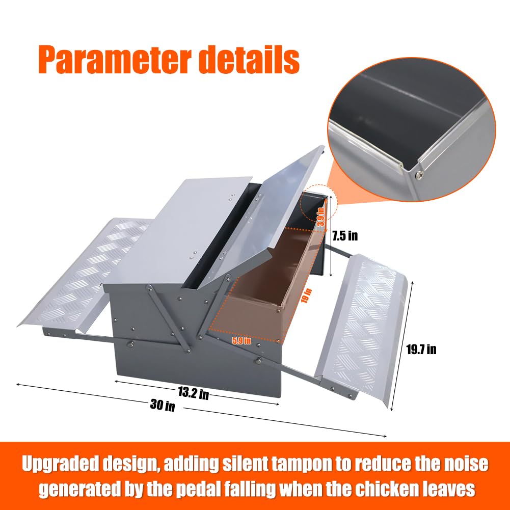 TREADLE DESIGN: The metal treadle automatic chicken feeder trough is designed using the lever principle. When chickens step on the treadle, the feed trough lid will open automatically and chickens can eat; when chickens leave the treadle, the feeding trough lid will close, water-proof and moisture-proof.
