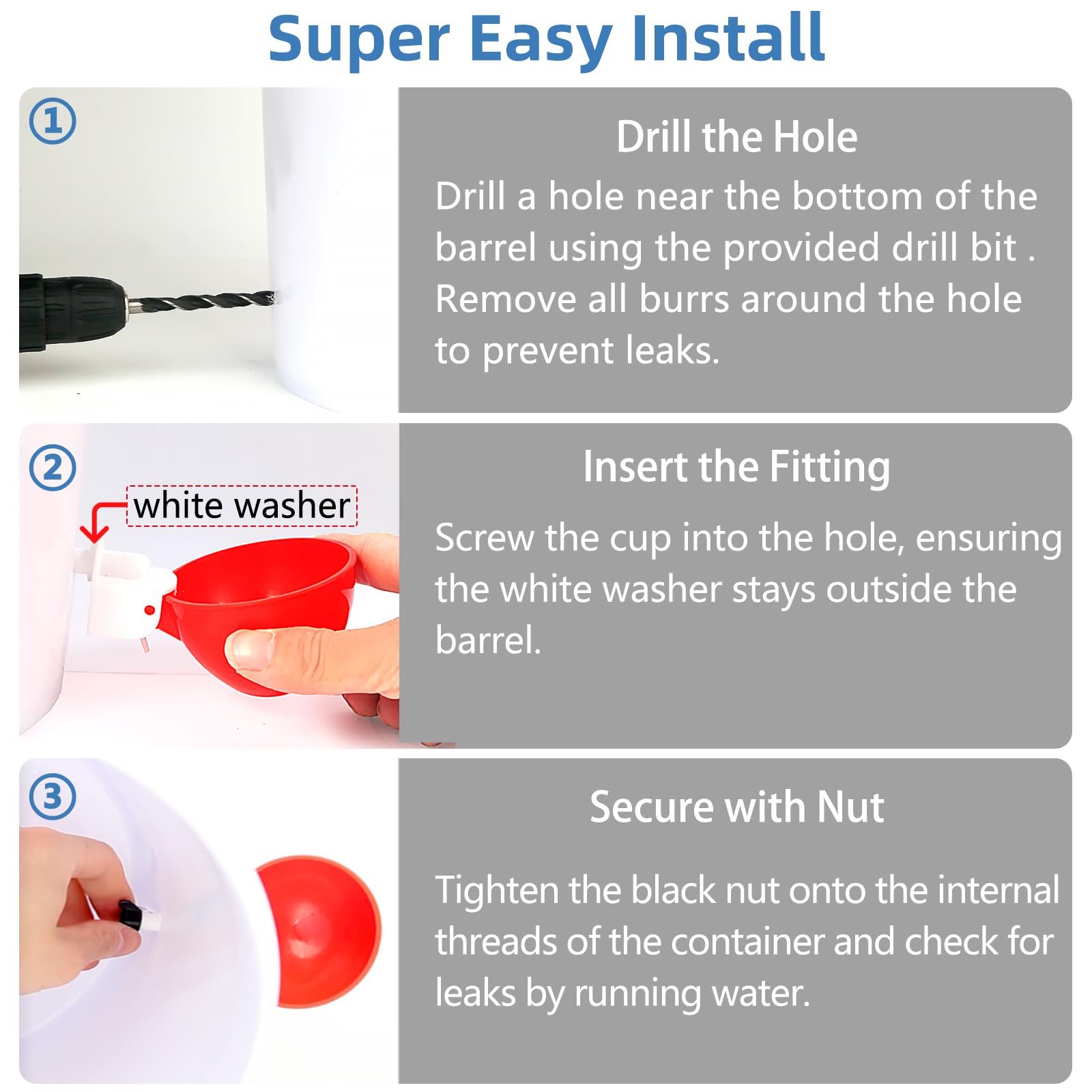 【Easy-Install Chicken Water Feeder 】This easy-install Automatic chicken waterer sets up in minutes—just drill one hole in your container or 5-gallon bucket (drill bit included) , snap it in, and you're done! Complete with illustrated instructions for hassle-free setup.