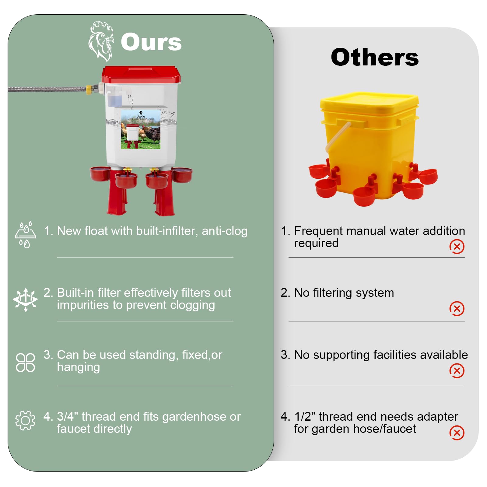 Automatic Float-Controlled Design - This automatic chicken waterer features an advanced float valve system that provides automatic water refills and stops when full, effectively preventing overflow and maintaining a consistent water level. It includes a built-in filter to keep the water clean and fresh. The gravity-fed design saves time and effort, making it perfect for busy or frequently away poultry keepers