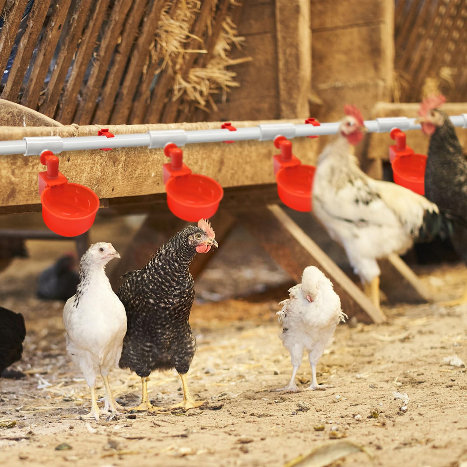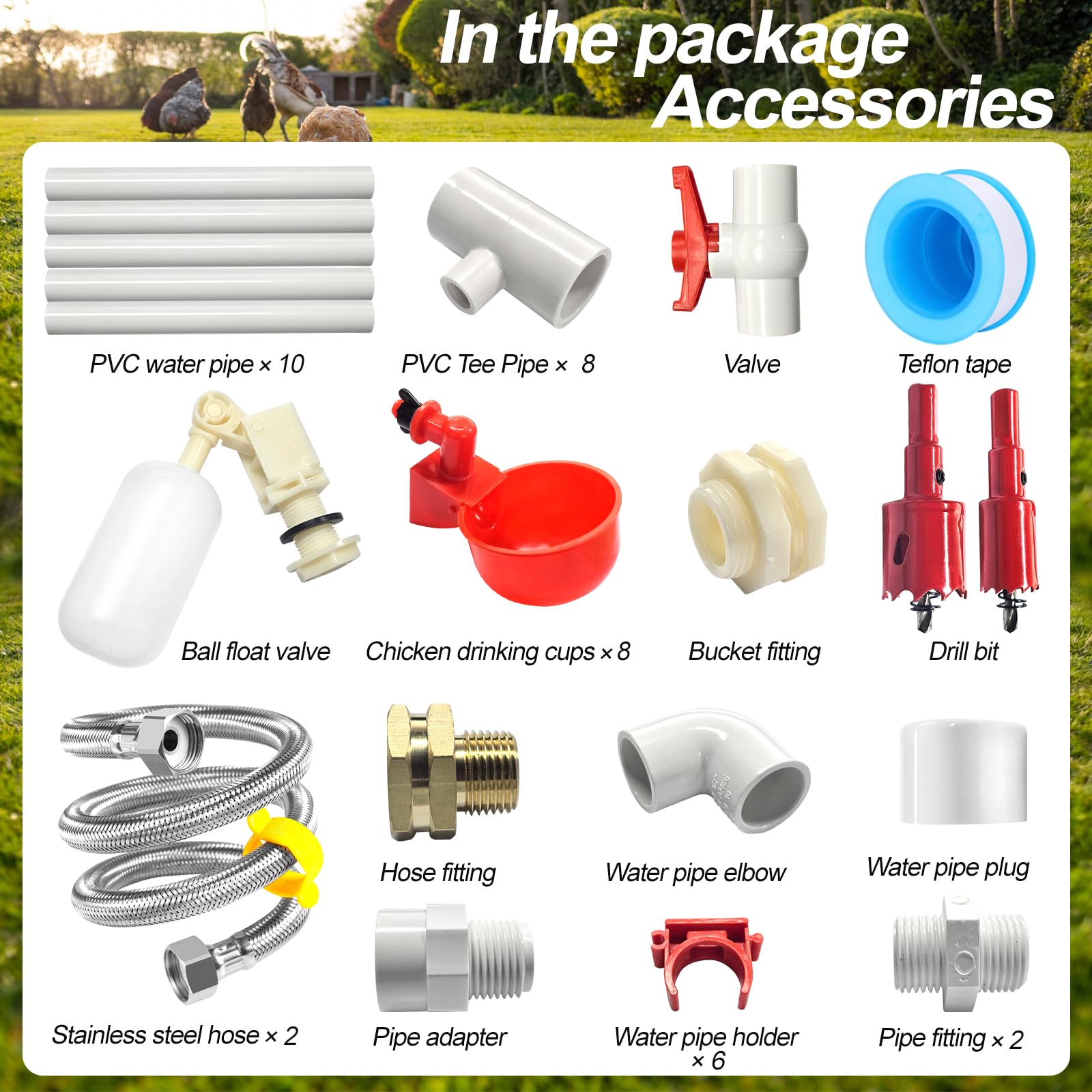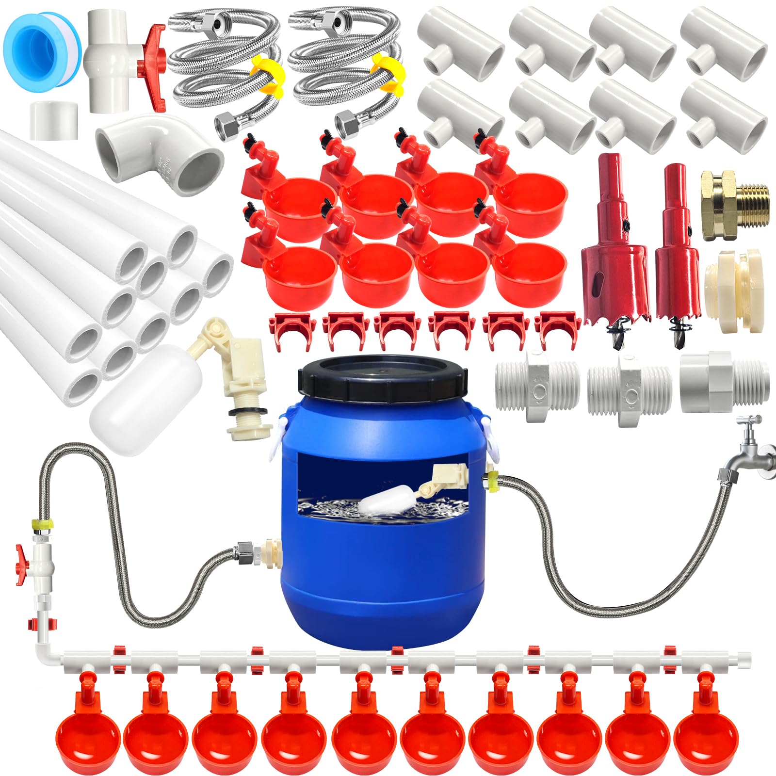 【Automatic Chicken Waterer System Kit】- The chicken water feeder system automatic includes 8 PCS chicken water cups, 10PCS PVC Pipeline, 8PCS pvc tees, 1 float valve, 2 stainless steel hoses, 1 PCS Valve, 1PCS valve 1PCS tape teflon,1 PCS bucket fitting, 2pcs drill bit,1 set hose fitting, 1pcs pipe adapter,1pcs water pipe elbow, 6pcs water pipe holder,1pcs water pipe plug,2 PCS Pipe fitting,1PCSinstruction books.All you need is an extra bucket and PVC glue to easily set up the entire automatic chicken water dispenser.