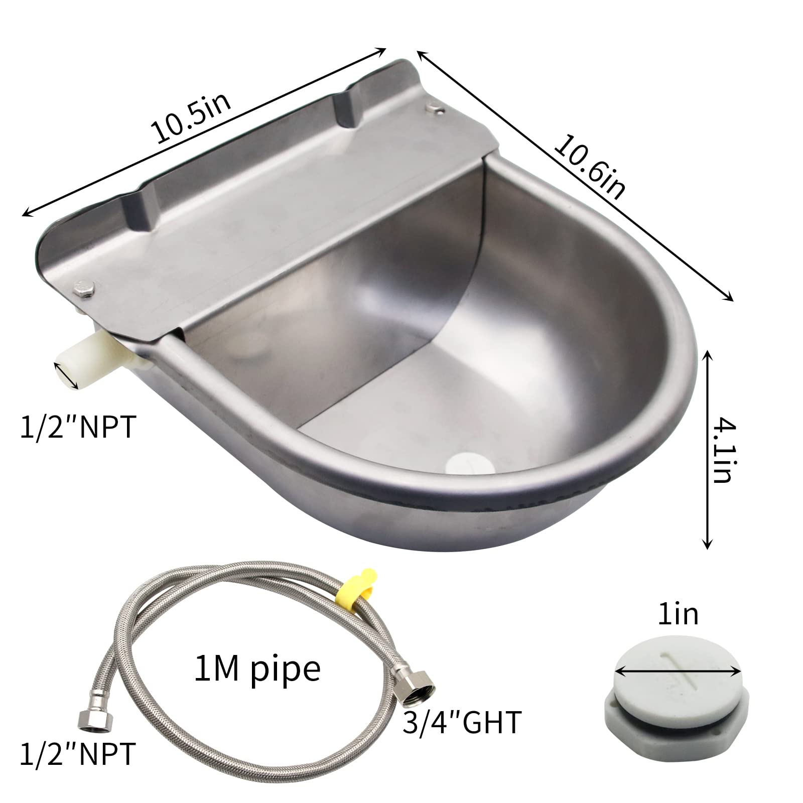 -Product includes :1* stainless steel water bowl (with drain hole), 1 * 1m water hose,1 *plastic water float,2 *drain plugs