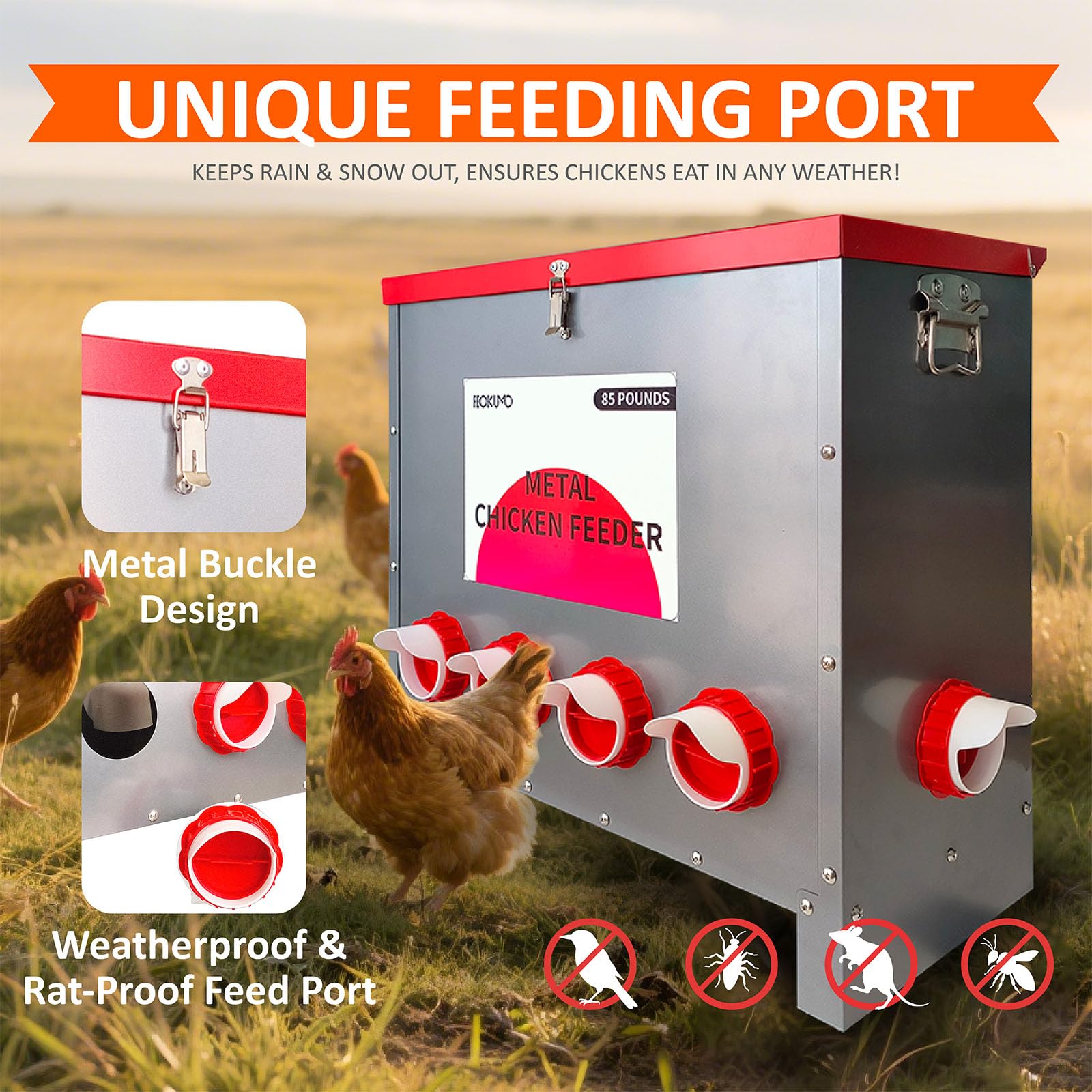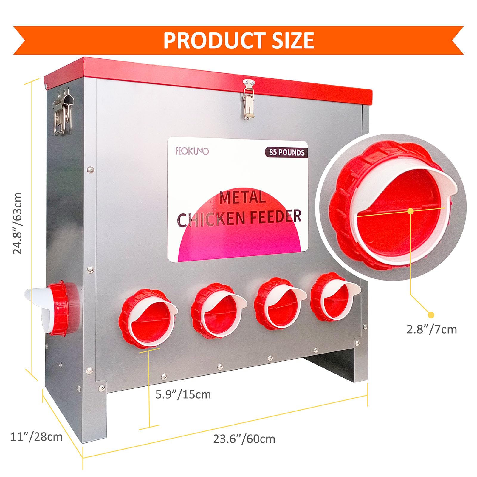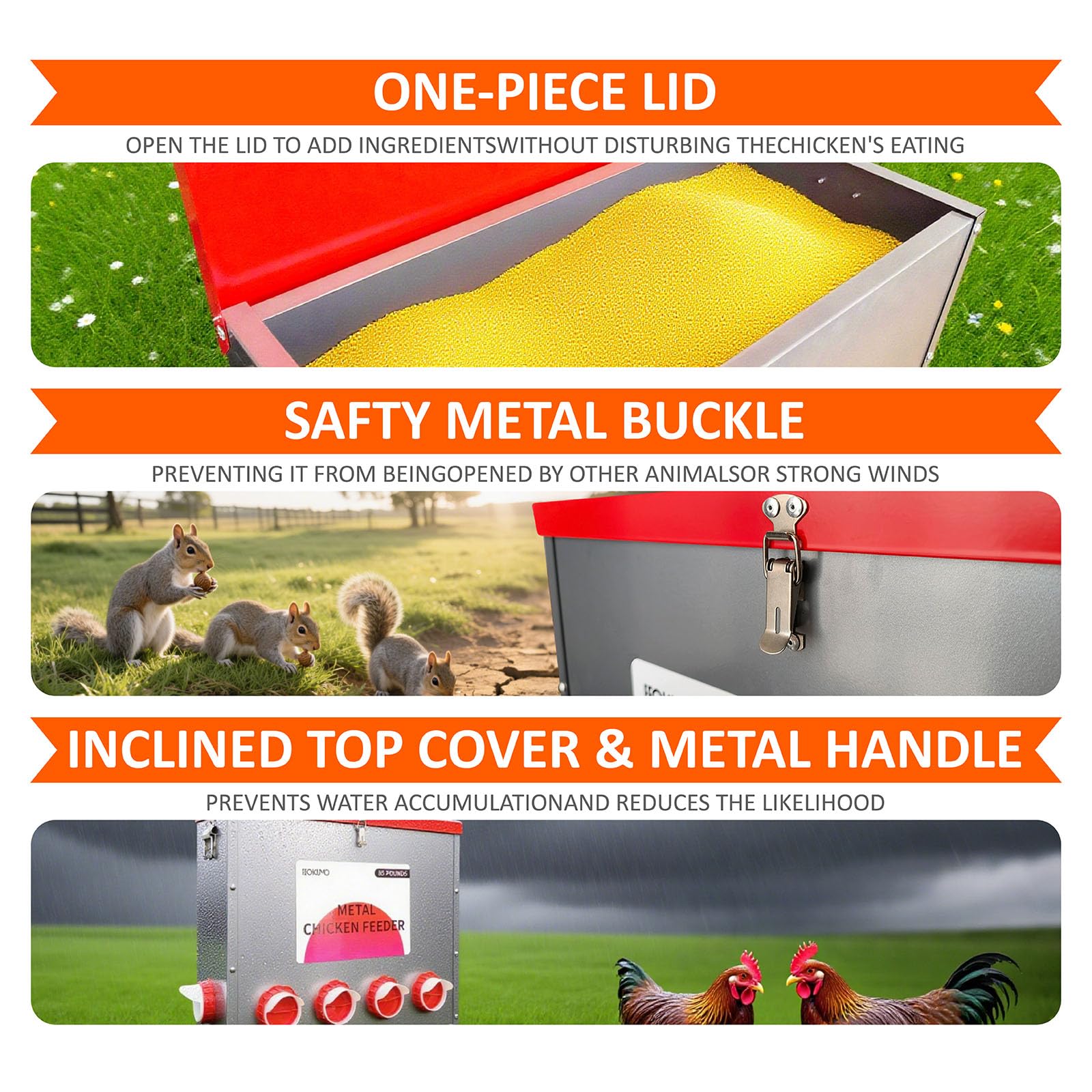 【Built Tough for All Seasons】 Our chicken feeder experience years of reliable service with our heavy-duty, rust-proof metal construction. It laughs off sun, rain, snow, and animal attempts, outlasting flimsy plastic feeders effortlessly.