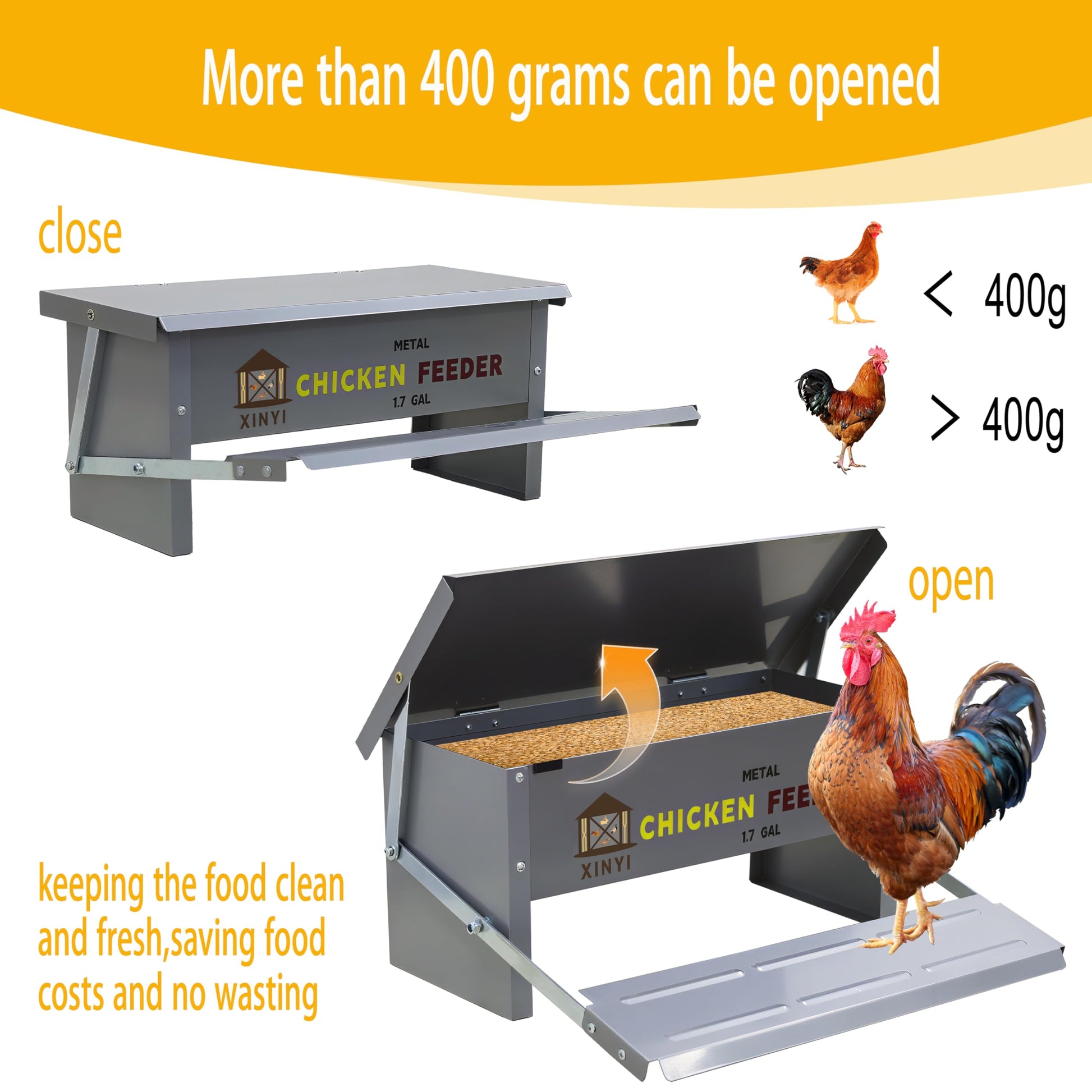 Rodent Proof Chicken Feeder: Anti-slip gravity treadle design.A chicken weighing more than 400g/0.88lb/14.1ounce can easily open the top cover by standing on the treadle, it automatically closes when not under force,So our poultry feeders are rodent proof 、 weatherproof、Anti-scorching sun、 squirrel proof、bird proof.