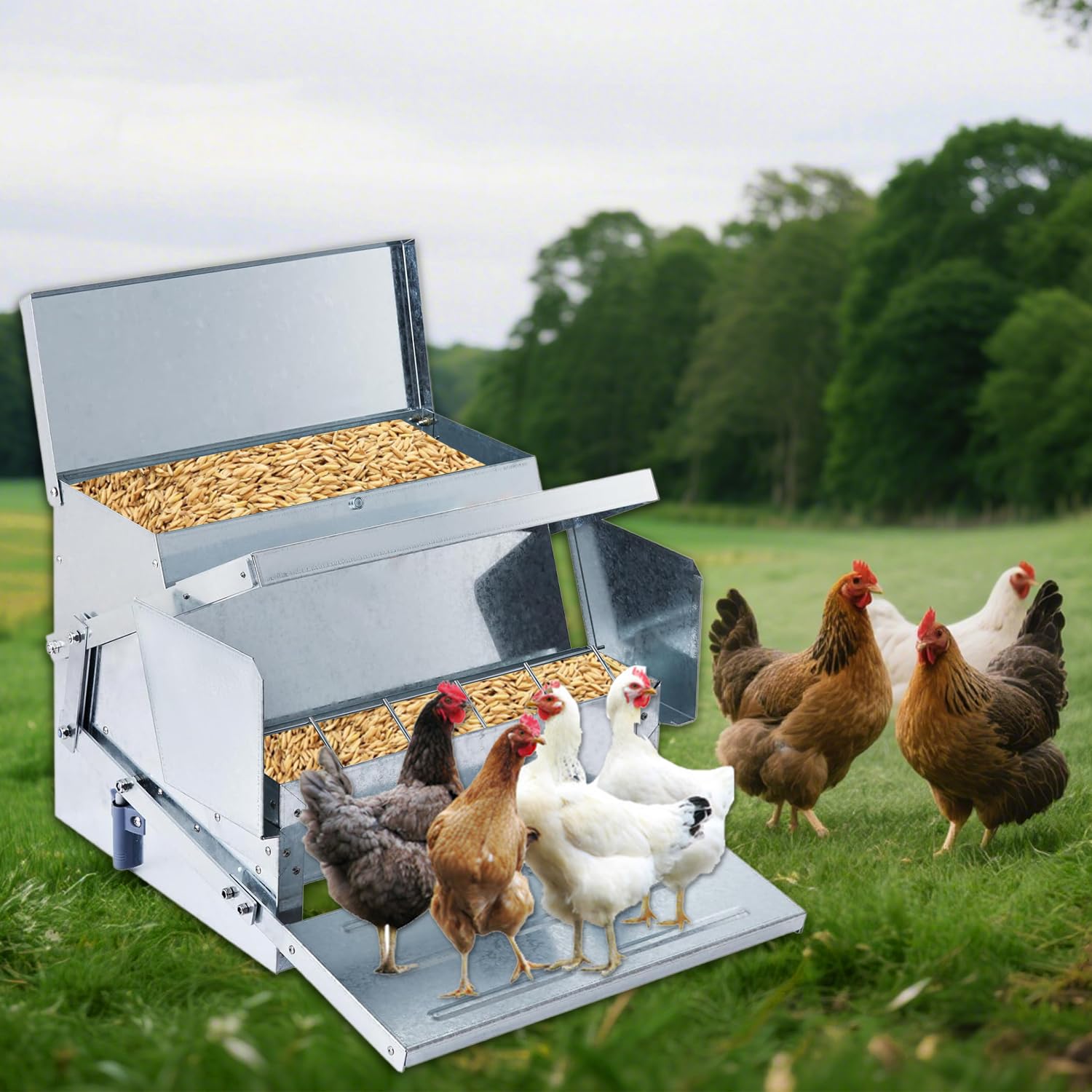 Weatherproof Design: This treadle chicken feeder features a rain and moisture-proof design, ensuring that feed stays dry and fresh, even in challenging environments. Protecting your poultry feed from the elements promotes health and efficiency in feeding.
