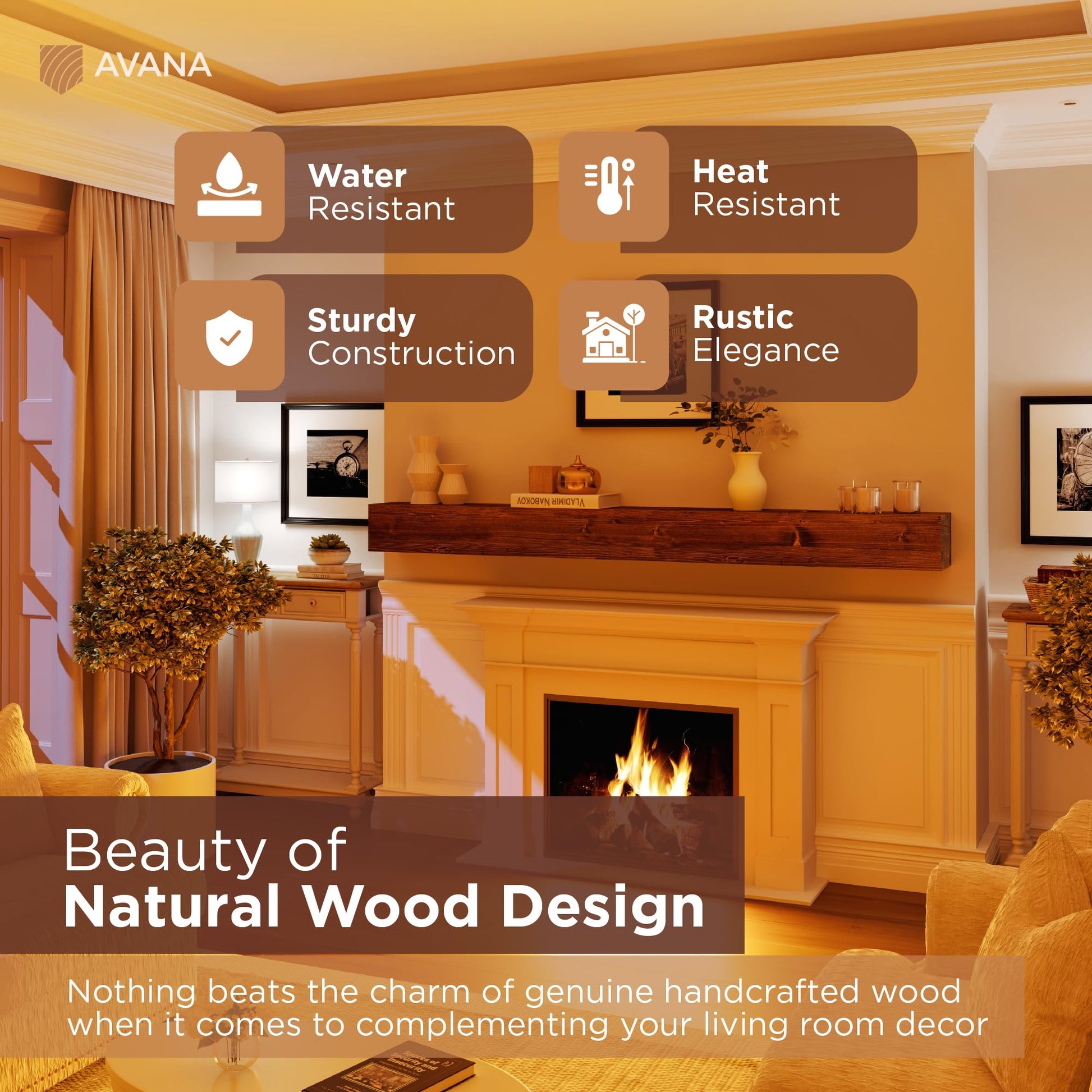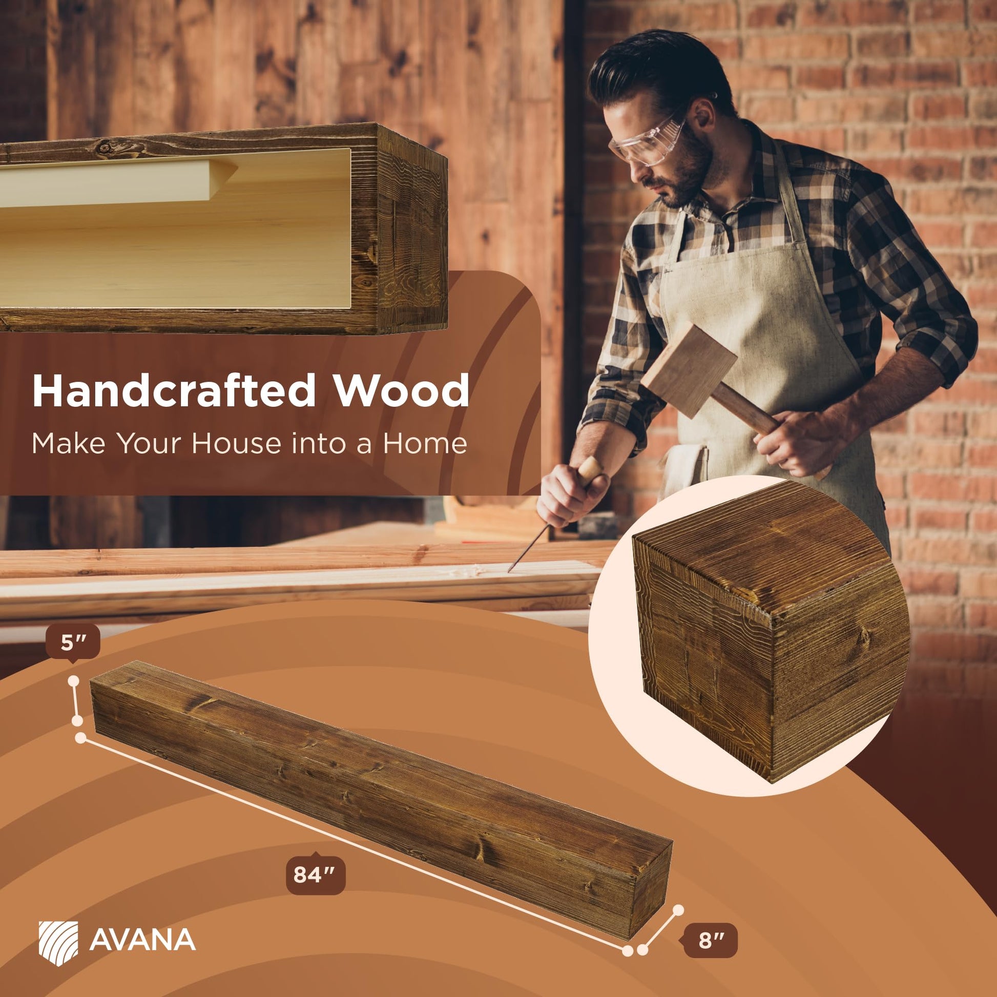 Rustic Traditional Wood Mantel — The natural grain of your floating mantel shelves bring a gracious charm to your interior design. Your 84 inch floating shelf is handcrafted from solid pine with a fireplace mantle shelf 84 Rustic Traditional, water-resistant finish