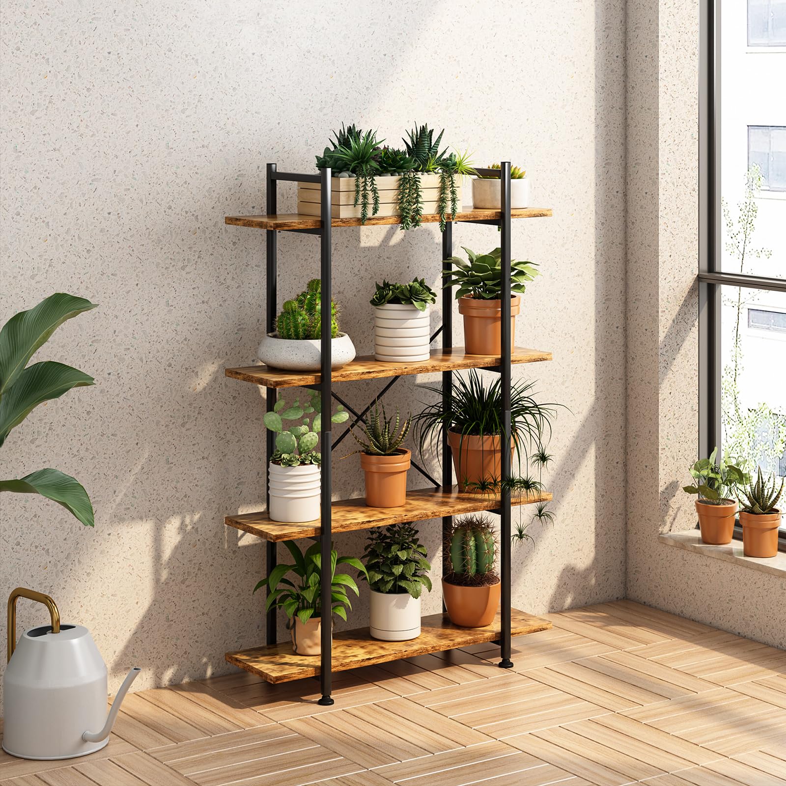 Azheruol 4 Tiers Bookshelf Rustic Brown Wooden Storage Shelf, Industrial Shelf Book Organizer,Modern Open Display Storage Bookcase,Metal Bookshelf Standing Tall Shelving Units for Home Office Study.