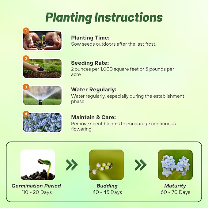 • SELF-SEEDING FOR YEARLY BLOOMS: These Forget-Me-Not flower seeds are self-sowing, creating new blooms each season by naturally dropping seeds. This feature makes them an excellent choice for memorial seed packets or celebration of life ideas, providing a meaningful and low-maintenance ground cover that returns each year as a gentle reminder.