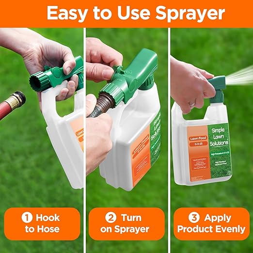 • Easy to Use: Our 0-0-25 Lawn Fertilizer Food Comes With a Ready-To-Use Hose End Sprayer that Applies the Perfect Ratio of Liquid Nutrients for Lawn Applications. Covers up to 3,200 Square Feet, when Using the Attached Sprayer.