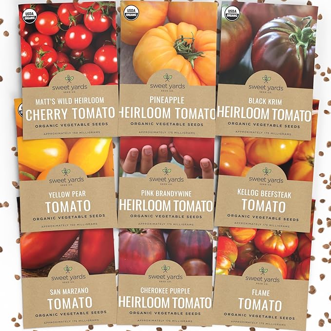 • TOMATO GARDENER SEED VARIETY PACK: A vibrant collection of 9 heirloom tomatoes! From the fruity Kellog Beefsteak to the sweet Yellow Pear, this pack brings color, flavor, and garden fun to your plate. Perfect for slicing, sauces, or snacking. Grow a rainbow of tomatoes!