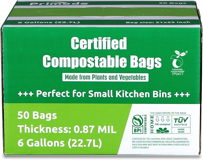 Primode Compostable Bags 6 Gallon Food Scraps Yard Waste Bags, 50 Count, Extra Thick 0.87 Mil. ASTMD6400 Compost Bags Small Kitchen Trash Bags, Certified By BPI And TÜV AUSTRIA