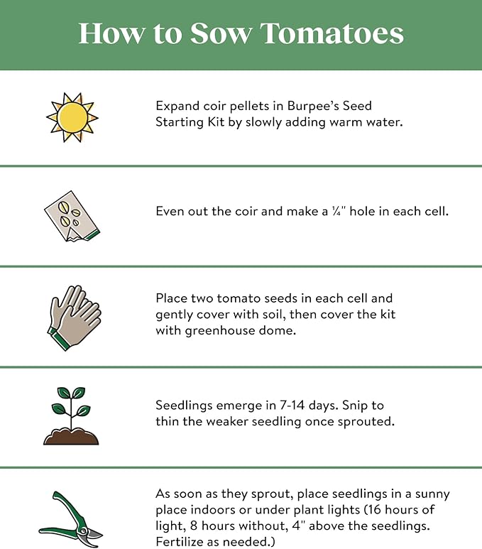 • SEED STARTING TIP: Sow tomato seeds indoors 6-8 weeks before average last frost. Harden off young tomato plants by leaving them outdoors in their containers up to a week before transplanting, after all danger of frost.
