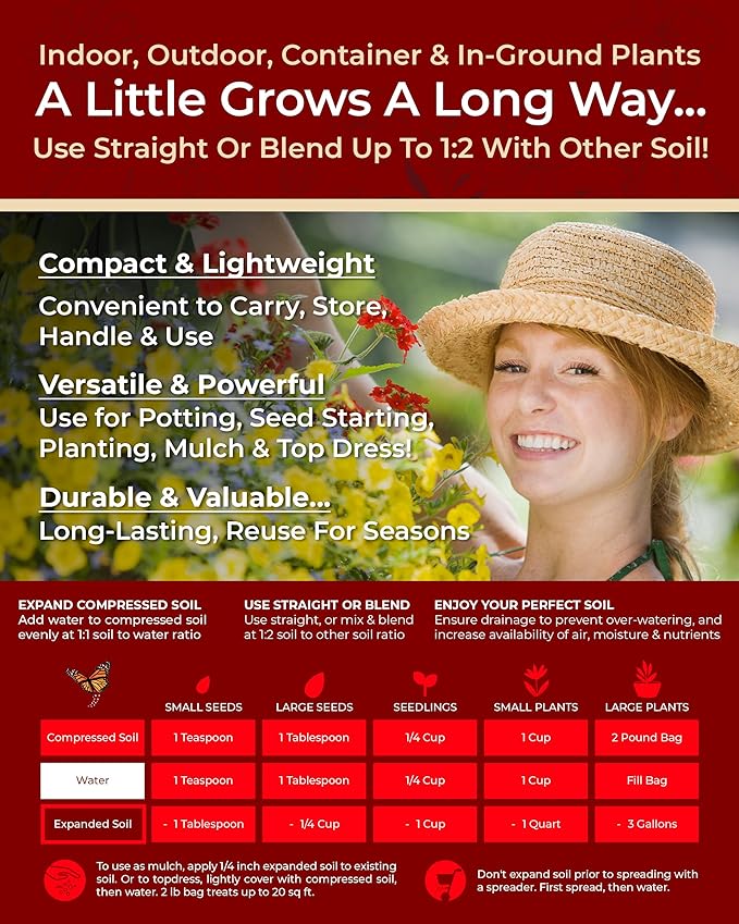• EASY to USE - Just add water 1:1 to compressed soil to expand up to 4X. Use 1 tsp for small seeds, 1 tbsp for large seeds, 1/4 cup per seedling, 1 cup per small plant, and 4 cups per gallon plant. Use expanded soil straight or blend 1:2 with other soil. Prevents overwatering, re-wets easily, and stays moist 3X longer. As mulch or top dress, apply 1/4 inch expanded soil or spread compressed soil and water. A 2 lb bag covers up to 20 sq ft.