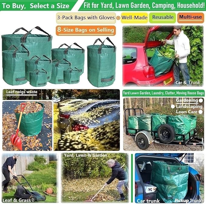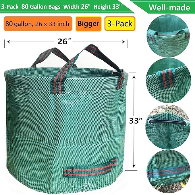 >> Package Included 3 Pack 80 Gallons (D26, H33 inches) Big Yard Debris Bags Lawn Gardening Waste Bags Reusable Yard Waste Bags with 1 Pair Gardening Gloves: Yard garden tarp bag is great for garden deadheading,mowing lawns,plants pruning,yard waste cleaning and hauling,landscaping debris,old sod and dirt removal,yard waste disposal and debris removal; It's great for farm bags,household storage bags,moving house apartment bags; Just send us email if any concerns, We will response within 48 Hours