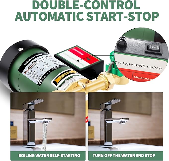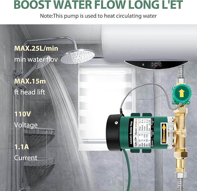 • Max Pressure: 1.5bar (21.7 PSI);Max Flow Rate: 396GPH(25L/min), Max Head: 49.2ft(15m); Connection size: 1/2" NPT; Liquid temperature range: 0 F- +212 F.the water boost pump with flow switch can automatically adjusts to your needs, Increase the pressure of household water tank and keep a steady pressure.