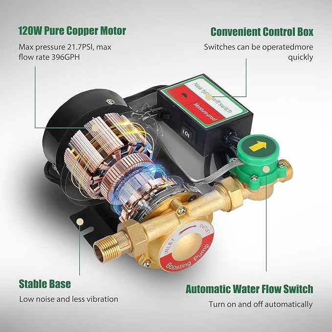 • Powerful 120W Motor, High Quality Water flow switch and full brass fittings included, All-in-one unit to make the water booster pump durable and provide enough water pressure for home use.