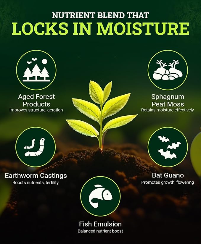 • MOISTURE-LOCKING NUTRIENT BLEND: This organic potting soil for plant is packed with aged forest products, sphagnum peat moss, earthworm castings, bat guano, and fish emulsion, each ingredient enhances moisture retention and nutrient uptake