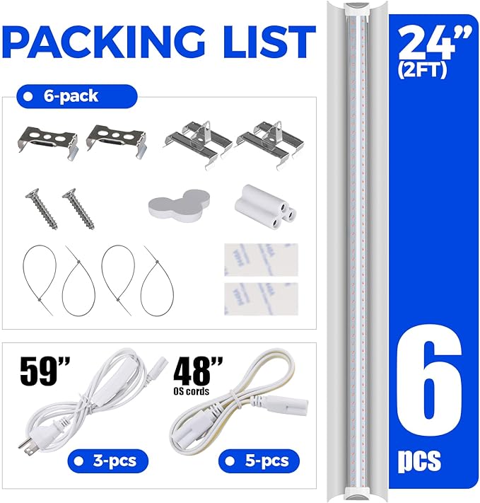 • What You Get: 6 x Barrina LED Grow lights, 3 x Power cords with ON/OFF switch, 5 x Connecting Cords(48''), 6 x Small Connectors, 24x Installation Clips, 12 x Tapes, 24 x cable ties