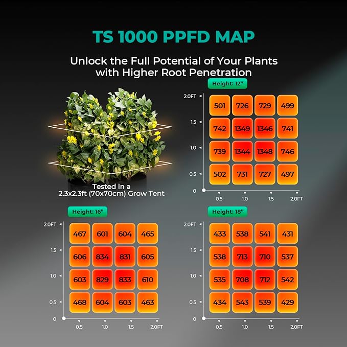 • 2025 UPGRADED HIGHLY-REFLECTIVE HOOD LED LIGHT: The upgraded white reflector design on TS1000 grow light is patented, With a refraction angle of 120°, increases the light utilization rate by 25%, to enhance its light intensity as well as assist plants in absorbing more light