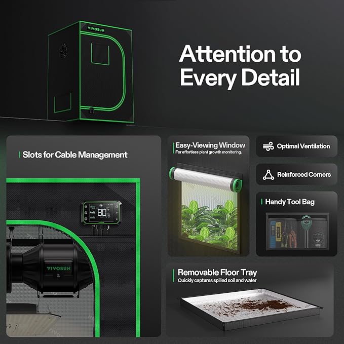 • Easy Observation & Maintenance: With a visible window made by transparent plastic set on the grow tent, you can check the growth status of your plants at any time; The window at the bottom is helpful for heat dissipation; The hook and loop fasteners on the cover of the window are easier for you to open and observe inside; It is also equipped with a removable floor tray that is convenient to be cleaned and conserved