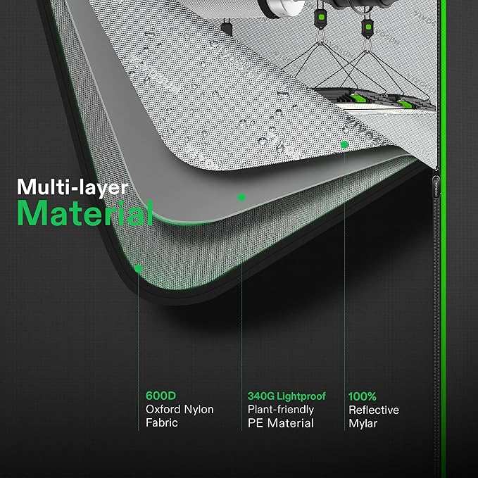 • Light-Proof Sealing: The 4 x 4 Roof Grow Tent prevents light from escaping; The interior 100% litchi reflective mylar lining increases the reflective efficiency by 1.5X compared to diamond mylar and it allows light to reach your plants from all angles