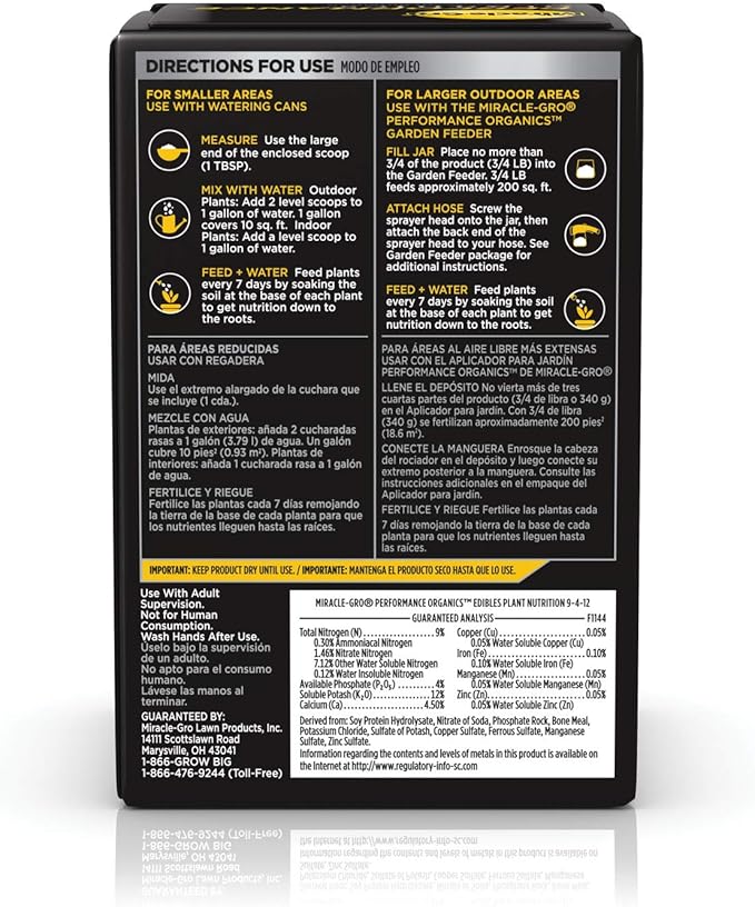 • Apply easily with the Miracle-Gro Performance Organics Garden Feeder or a watering can